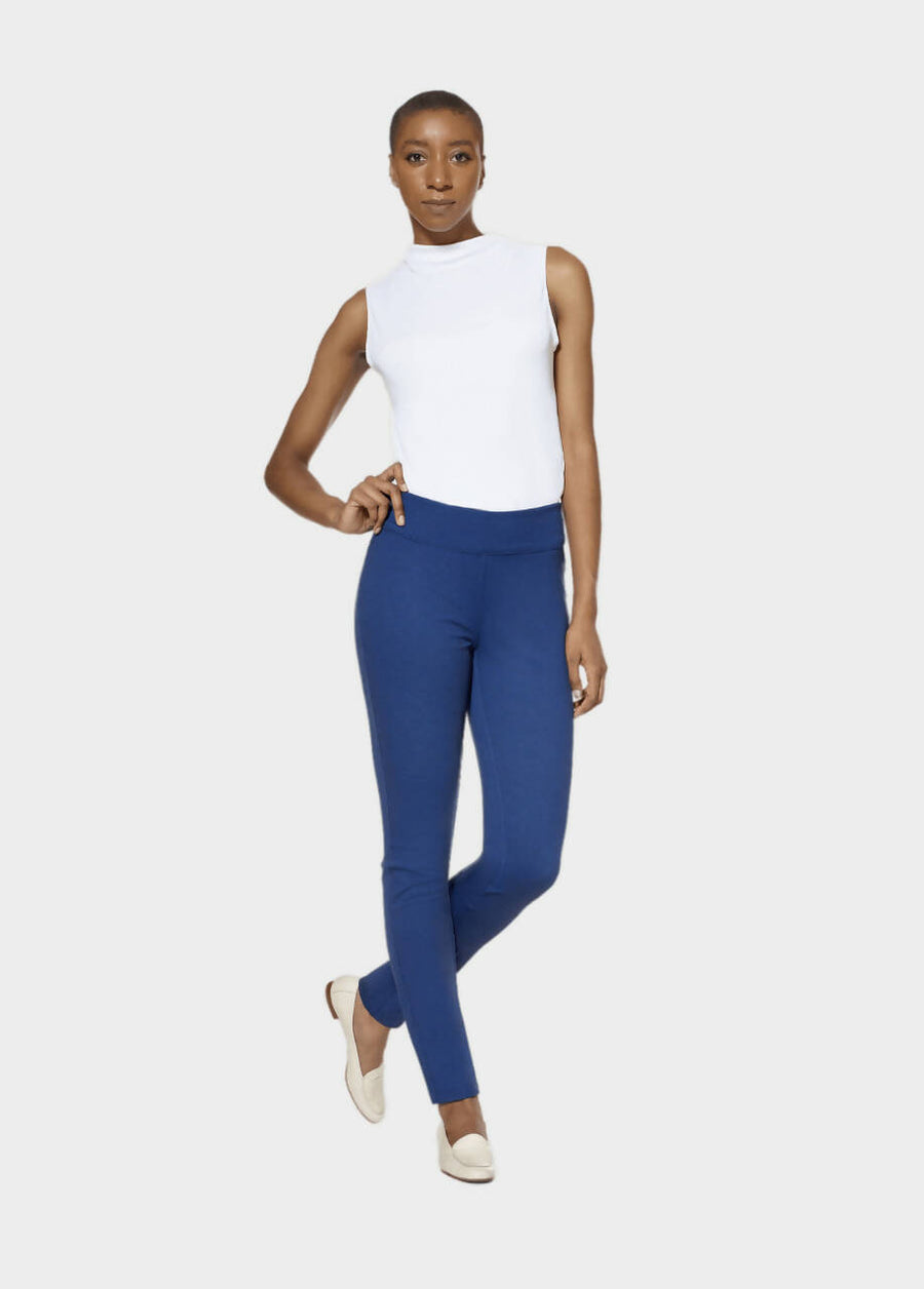 The ideal mix of ease and elegance, our Brooke Slim Pants are made from shape-retaining Ponte knit that reverses from solid cobalt blue to black. These trousers are designed with a feel-good elastic waist and bulk-free mock welt pockets. This leggings-trouser hybrid gives you the versatility of a tailored silhouette with the confidence of comfort.