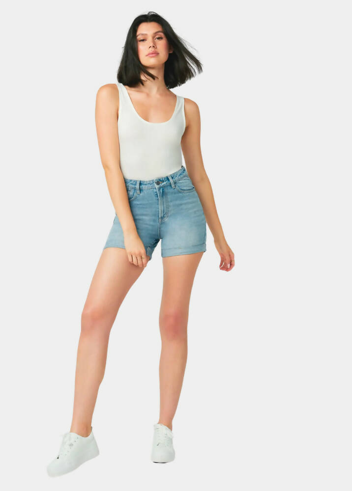 Meet the Sadie shorts! A shapely mid rise waist elevates these lightweight denim shorts with cuff, essential for sunny weekends.