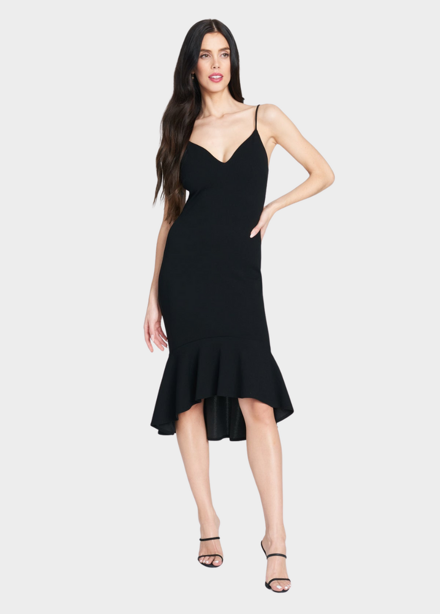 Have a little salsa moment with the Sophia midi dress! Featuring a v-cut neckline and a flared hi-low mermaid hem that balances the bodycon silhouette. Adjustable straps for added comfort.