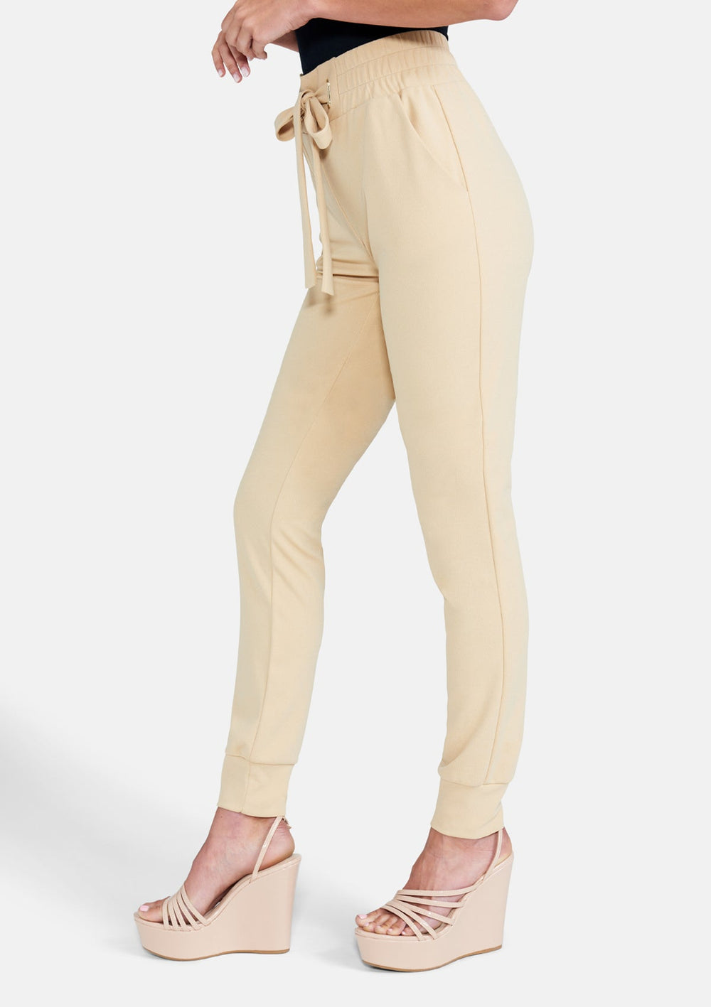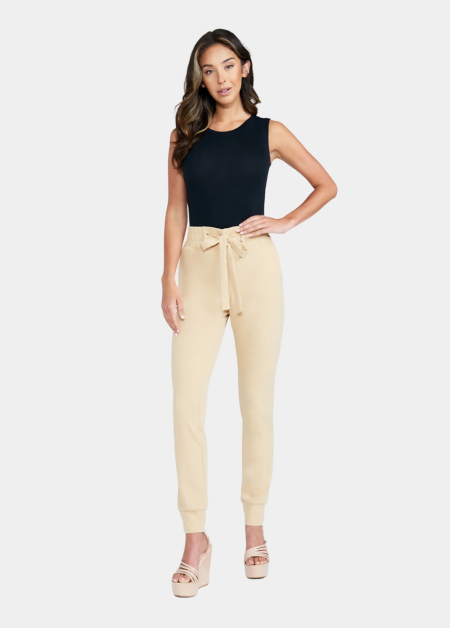 Introducing the Tianna joggers, the perfect combination of style and comfort! Crafted from a luxurious crepe fabric, these stretch-crepe joggers are the epitome of sophistication. Featuring a subtle metal tab and tie waist detail, these joggers offer a touch of elegance to your athleisure look. The comfy elastic waistband and cropped cuffs provide a flattering fit.
