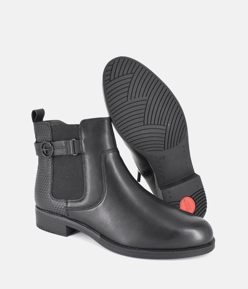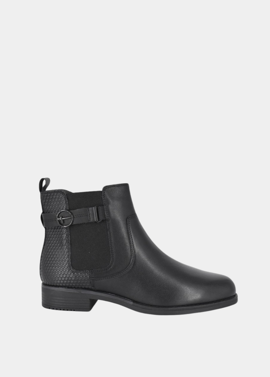 These ankle boots are a Stylish option from Tamaris and will look great with any outfit. Finished in a classic Black leather upper with buckle detail and sitting atop a small block heel. Featuring elasticated side gussets and in classic chelsea style is complete with a handy pull tab to make the boot easier to get on and off.