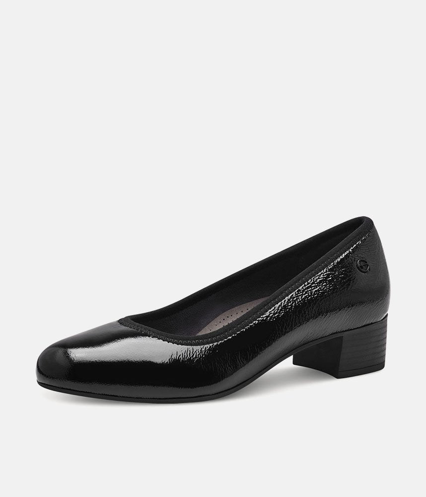 A Classic Block Heel Court shoe style from Tamaris crafted in Patent Leather with leather lining. The sleek elegant design ensures these shoes are easy to style with many outfits for a number of occasions. The low block heel is practical yet stylish and is perfect if you are wearing heels for longer periods of time. The block heel aids with stability and helps to absorb pressure on your foot. This classic style is definitely a wardrobe staple.