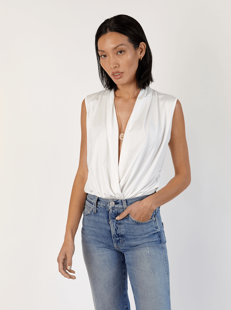 Piya is 5'11" and wearing a size Medium in the white and black bodysuit. She's a size 4. Please note that the Medium is a baggier fit on Piya (M will fit a size 8-10).