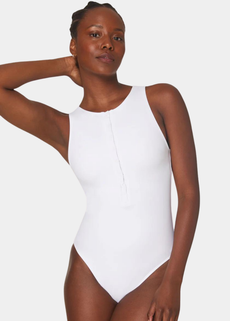 Fun and flexible, this one piece is an effortless mix of sporty and sexy with a high, snap-front neckline for versatile perfection.