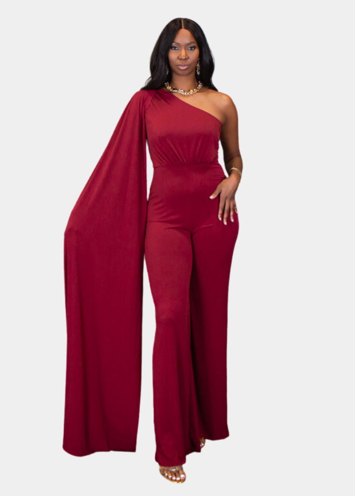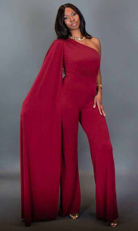 Arrive to your next event looking like a tall, elegant goddess in our Venus Jumpsuit. Onlookers will be mesmerized by the class and flow of this flattering jumpsuit. The cape sleeve adds just enough drama to the look as it sweeps with ground with every step you take. And for some versatility, you can drape the sleeve over your opposite shoulder for a completely different look (see product pictures).