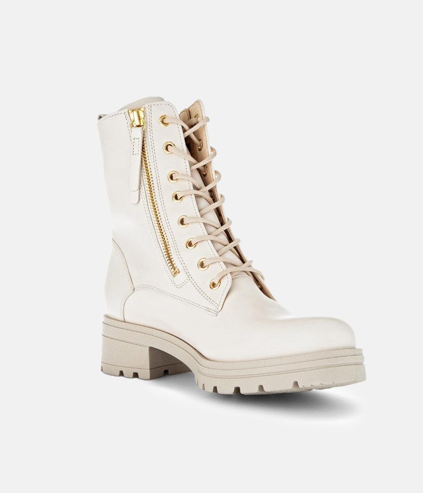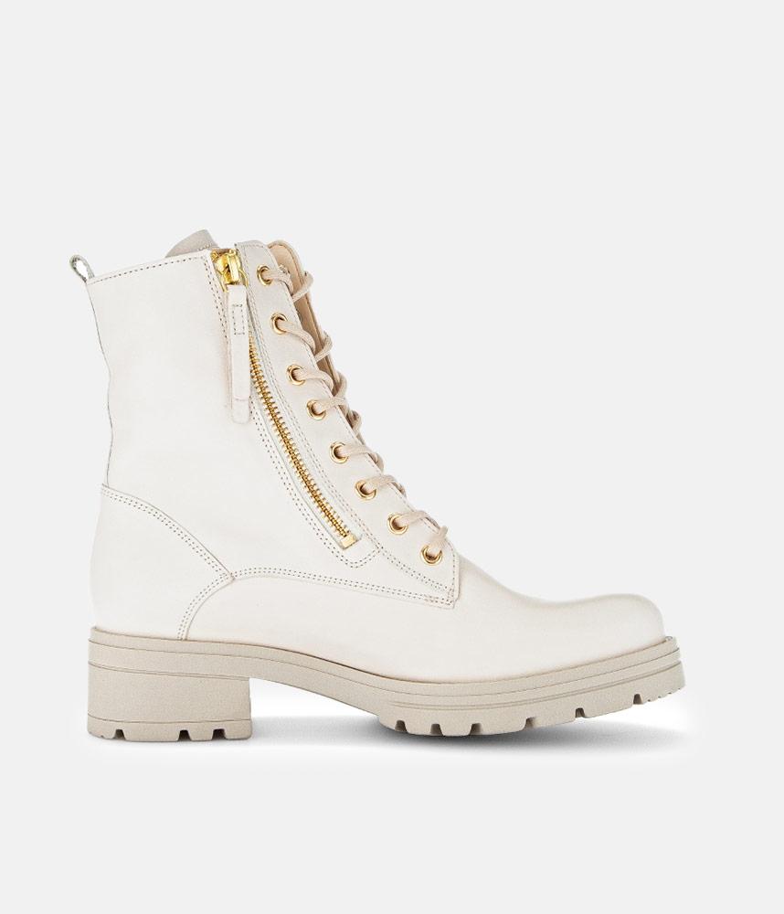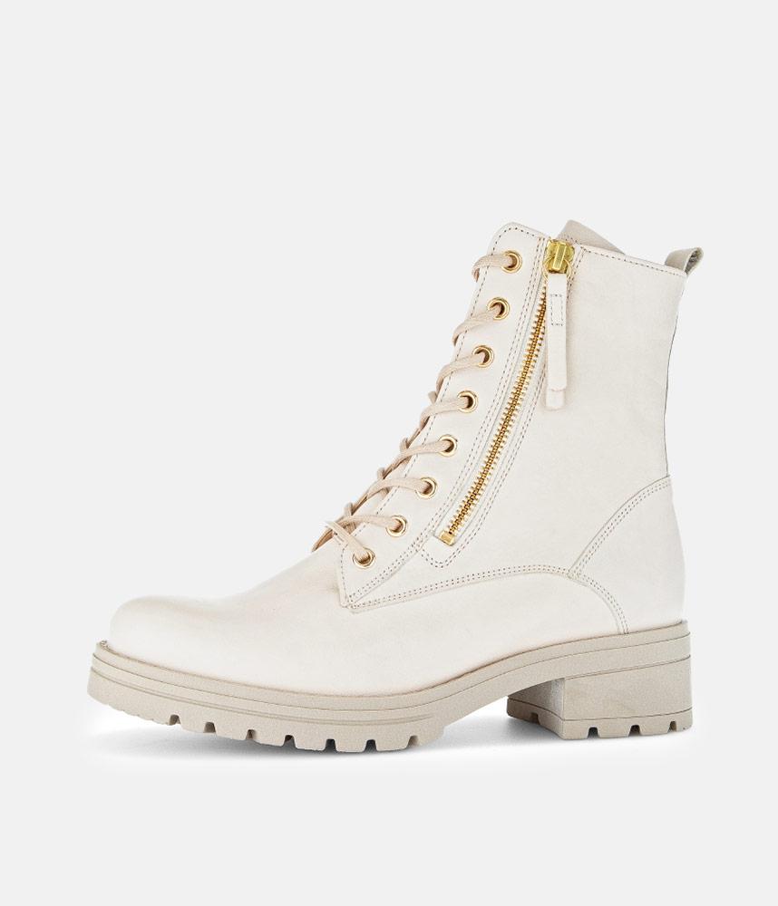 This is a contemporary Chunky block heel ankle boot from Gabor with a Premium Leather upper with contrasting gold zip and eyelets. Micro fibre fills the linings of this Combat style boot and provide support and comfort. The durable man-made sole ensures maximum traction and the double side zips ensures easy on and off.