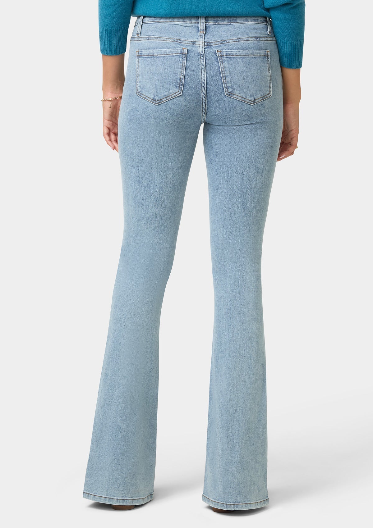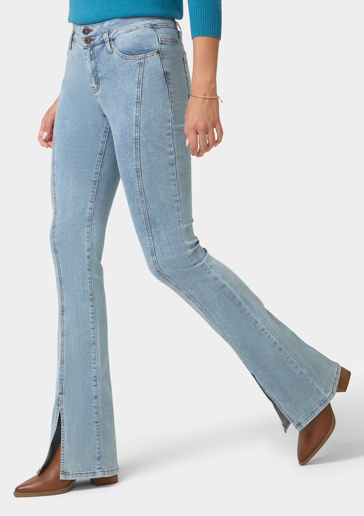 The Felicia Split Hem Jean is mid rise, slim fitting, 2 button closure, and features a bootcut hem with a front slit. A contemporary take on a 70's silhouette, accentuate your legs with elevated center seams before releasing into a split hem.