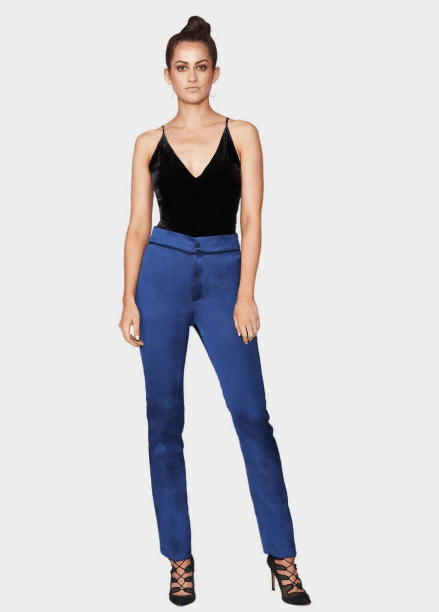 Made from heavy stretch satin, our Cicely pant is comfortable enough for all-day wear. It features contrast piping at the side seam, a zip fly, and a hook and bar closure.