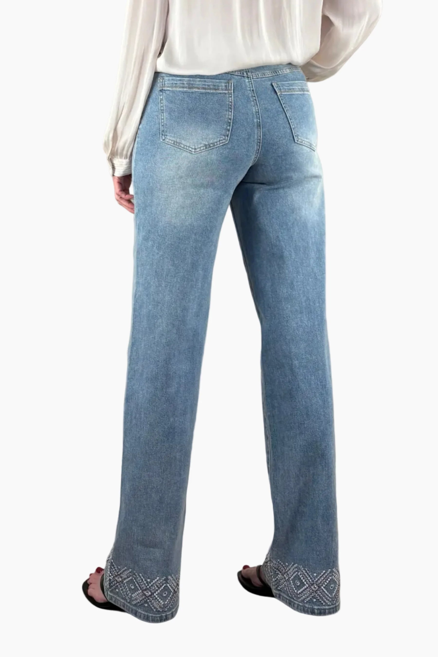Intricately embroidered and beaded wide leg jean for tall women