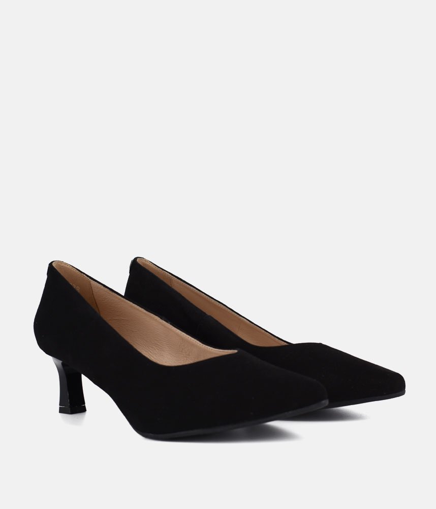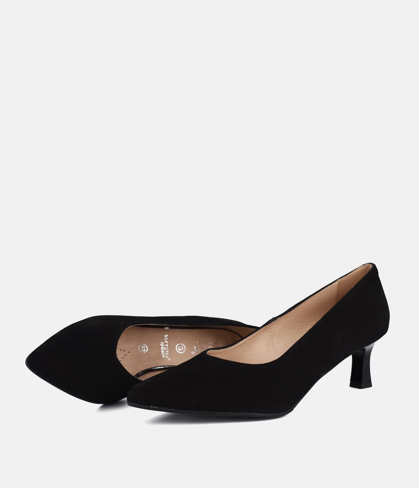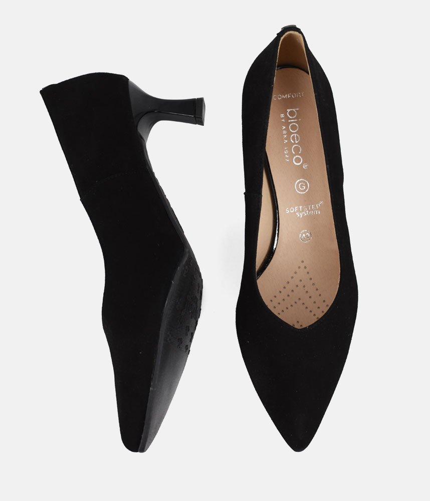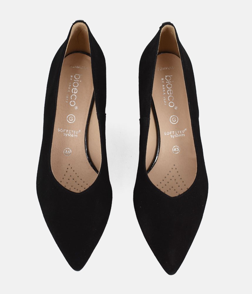 Step into timeless elegance and ultimate comfort with these Bioeco by Arka suede flared Stiletto heels. Featuring a sleek pointed toe design, this shoe is equipped with Soft Step System for a flexible and durable sole, as well as a cushioned leather insole for added comfort. You will love walking in these shoes all day long.