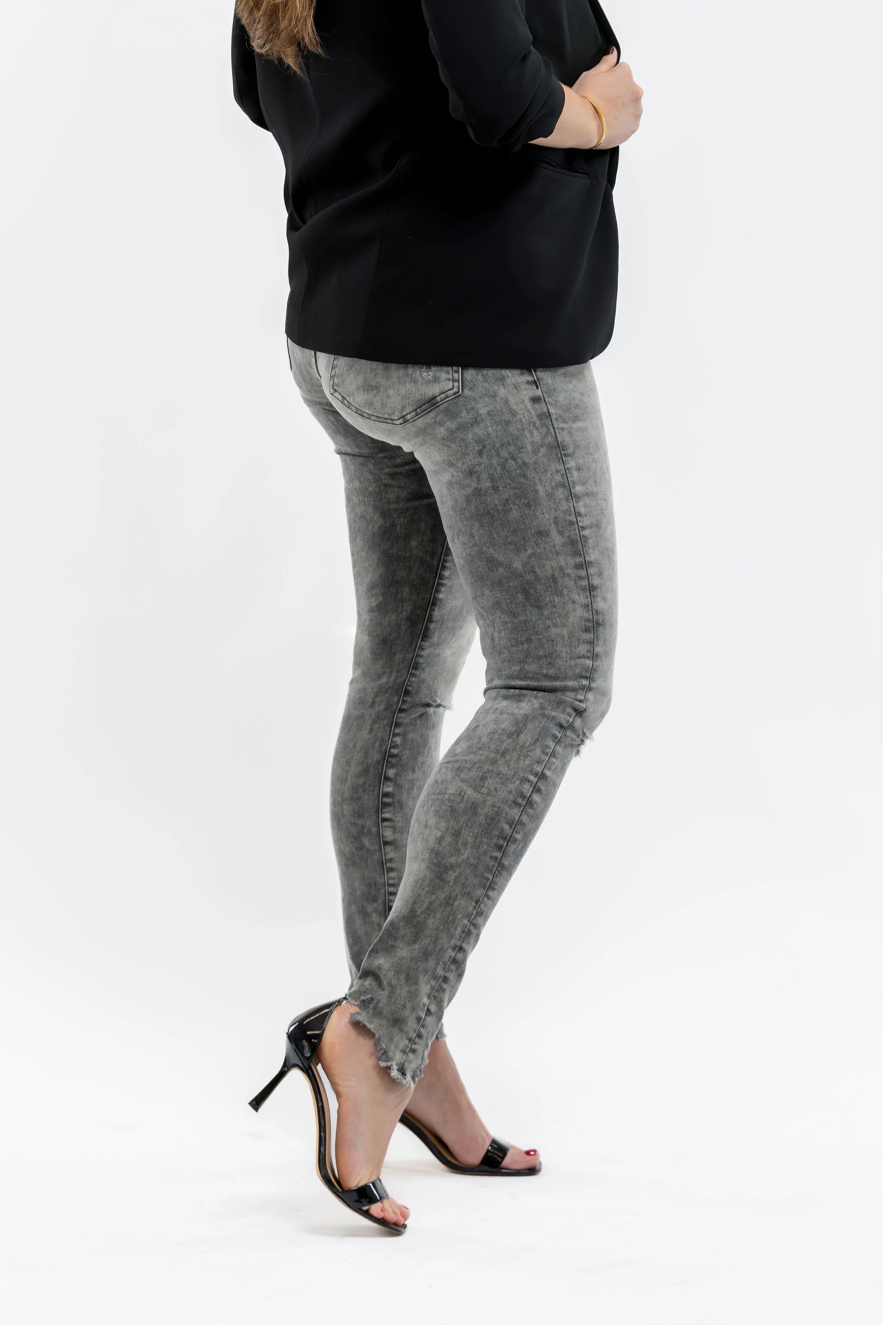 - Chopped, frayed hem designed to sit perfectly at the ankle.