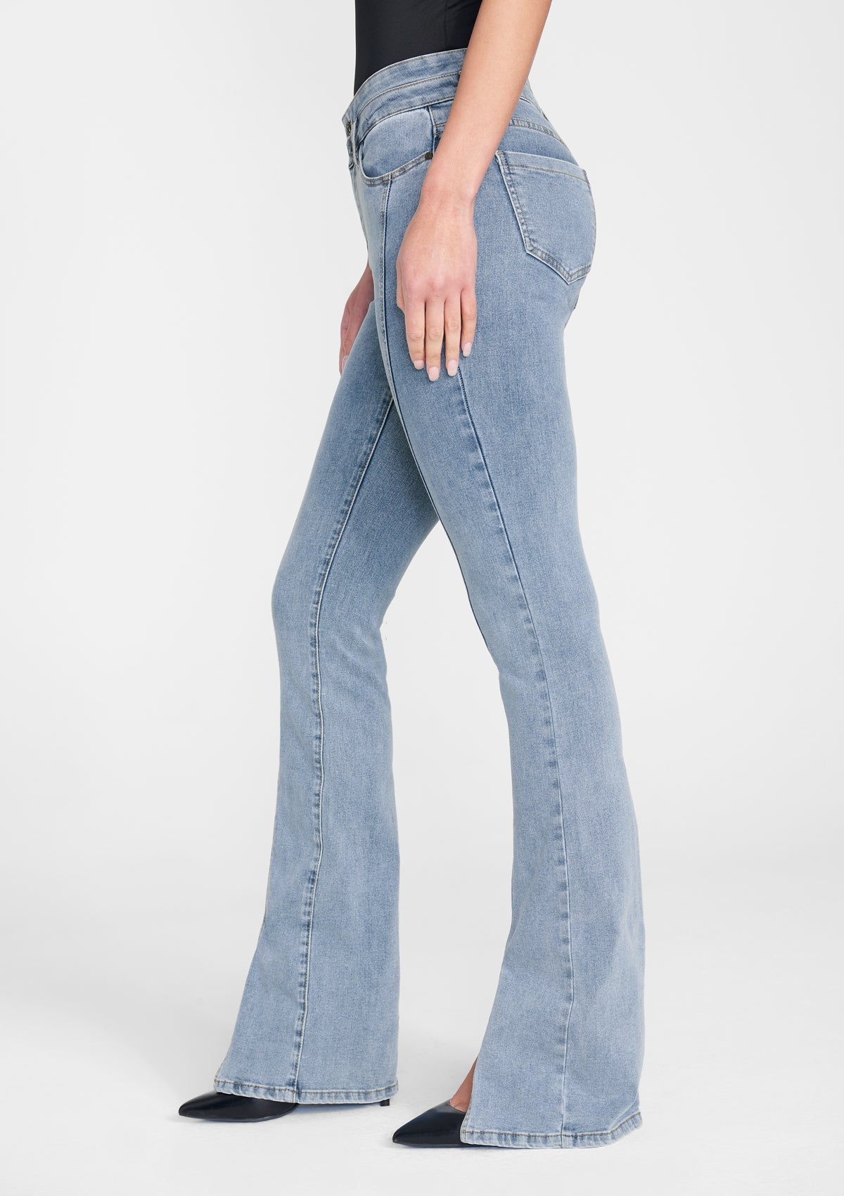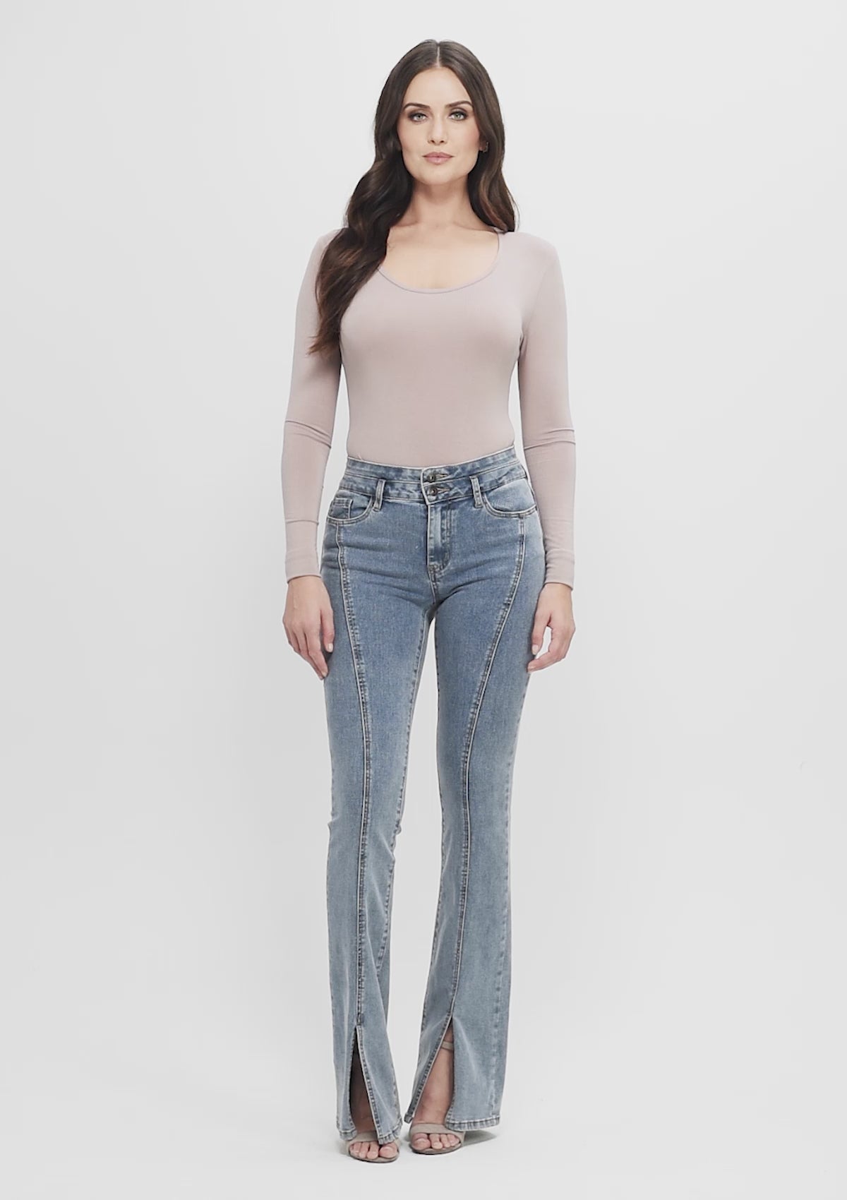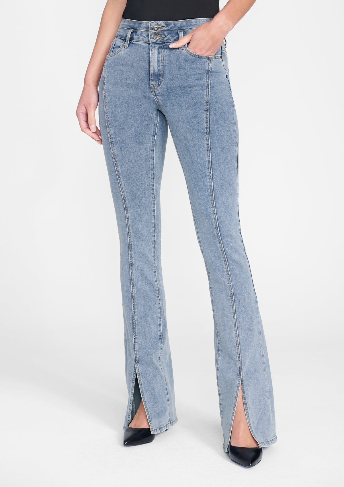 The Felicia Split Hem Jean is mid rise, slim fitting, 2 button closure, and features a bootcut hem with a front slit. A contemporary take on a 70's silhouette, accentuate your legs with elevated center seams before releasing into a split hem.