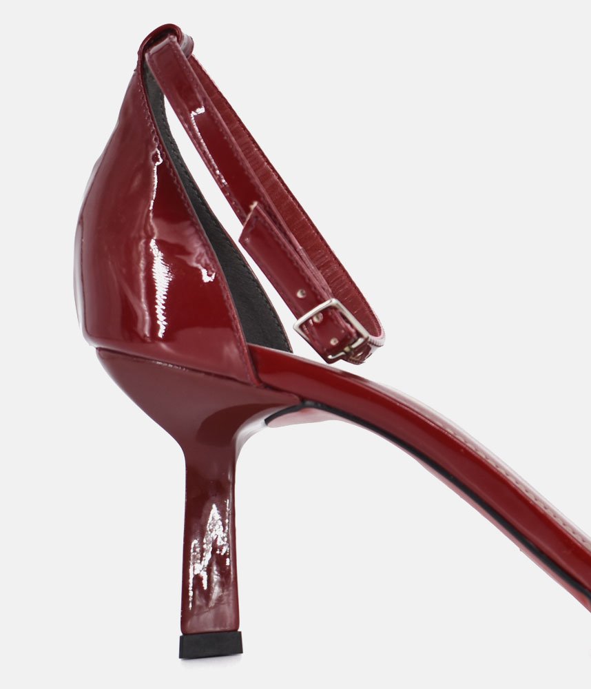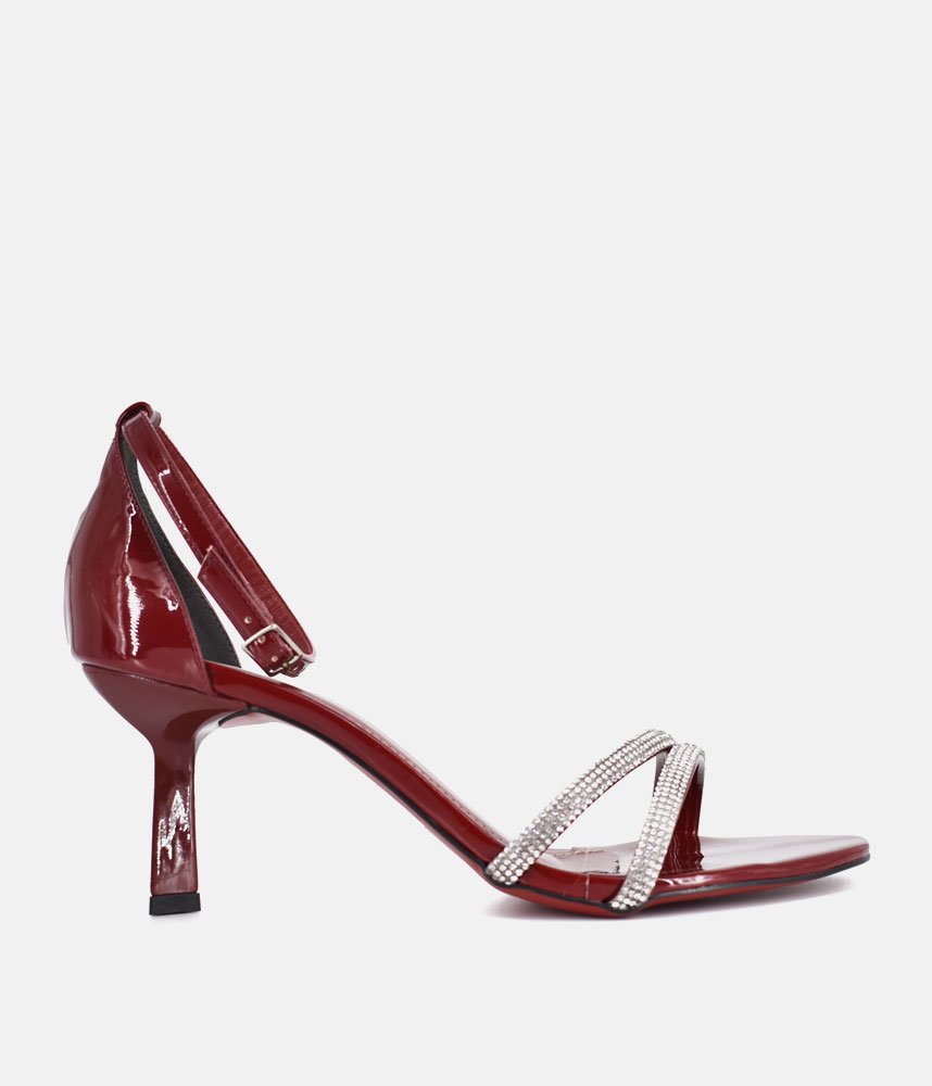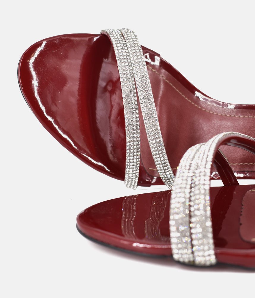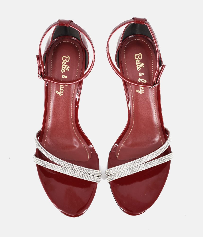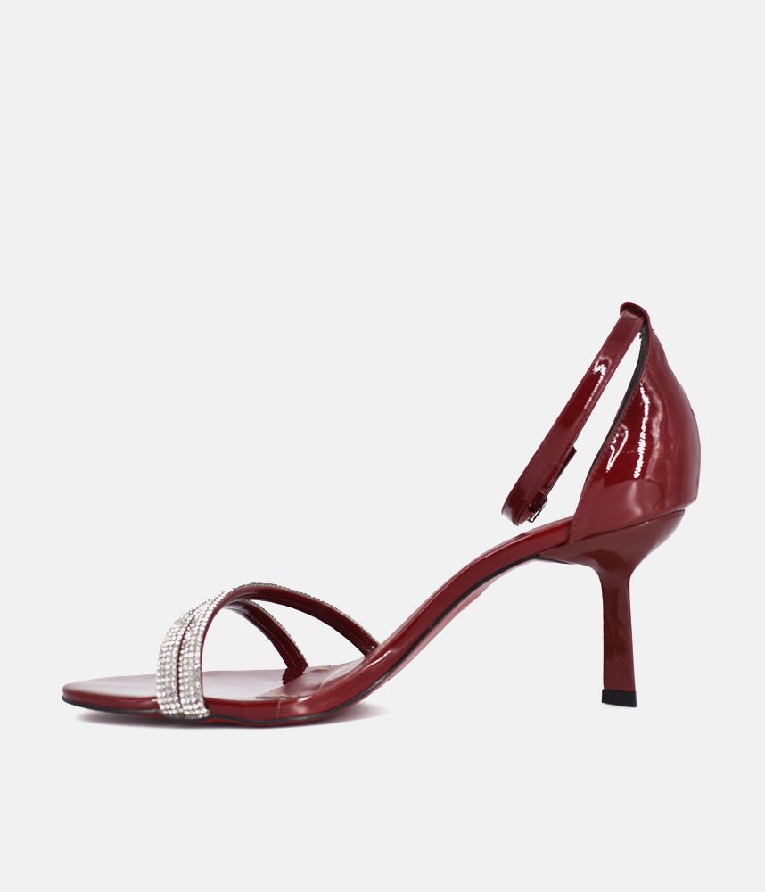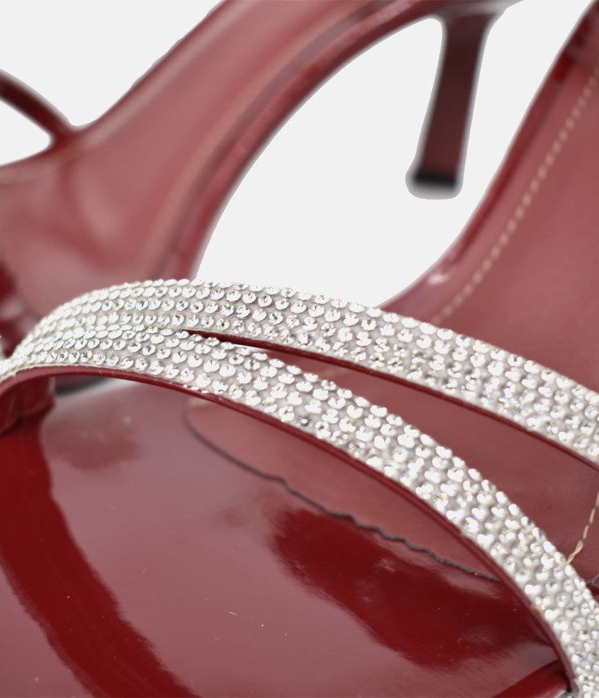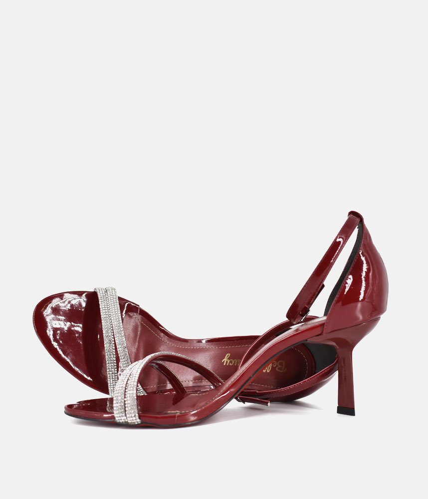 Make an unforgettable entrance in these gorgeous, glamorous heels. Perfect for weddings, parties, date nights, or any event where you want to sparkle! The rich, deep Burgundy patent finish catches the light and adds a luxurious sheen. Featuring two slender, sparkling diamanté straps across the toe, providing a secure fit and an eye-catching focal point. The perfect statement shoe to pair with little black dresses, evening gowns, tailored jumpsuits, or even dress up simple denim.