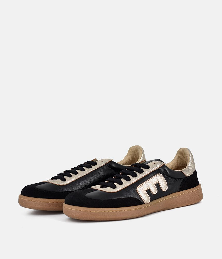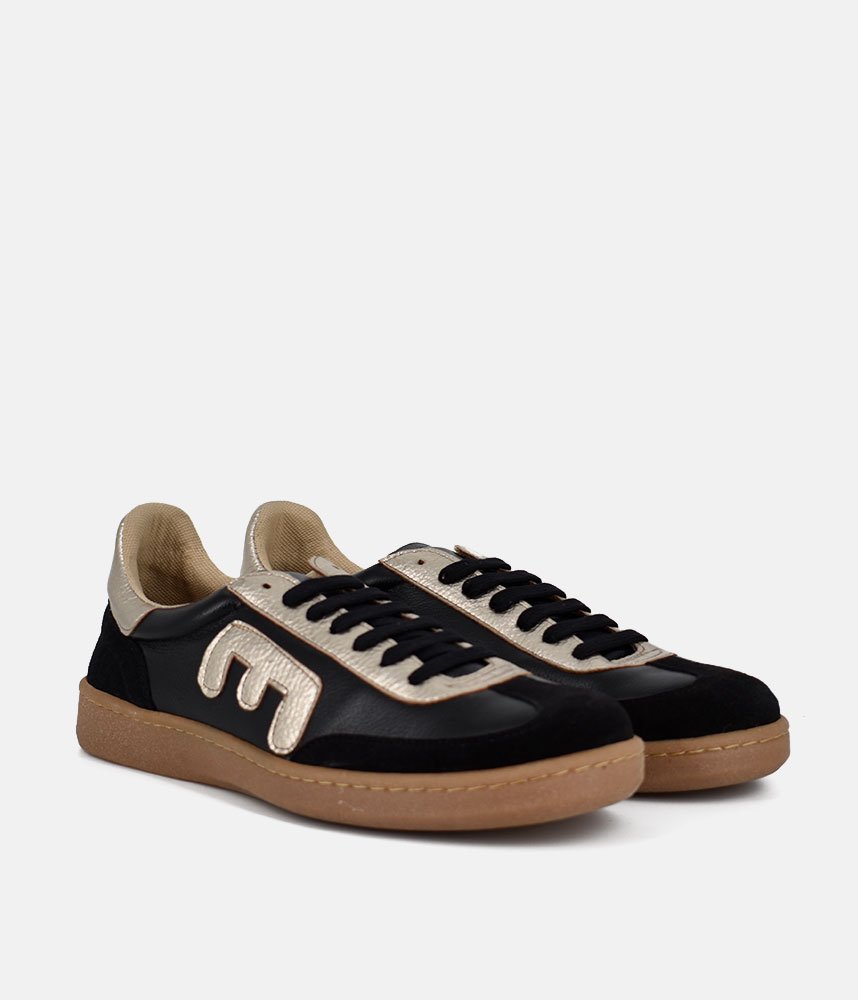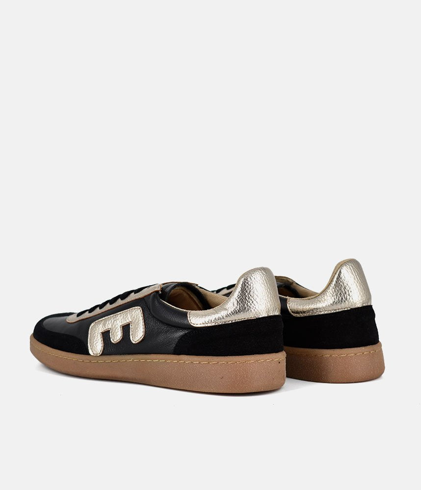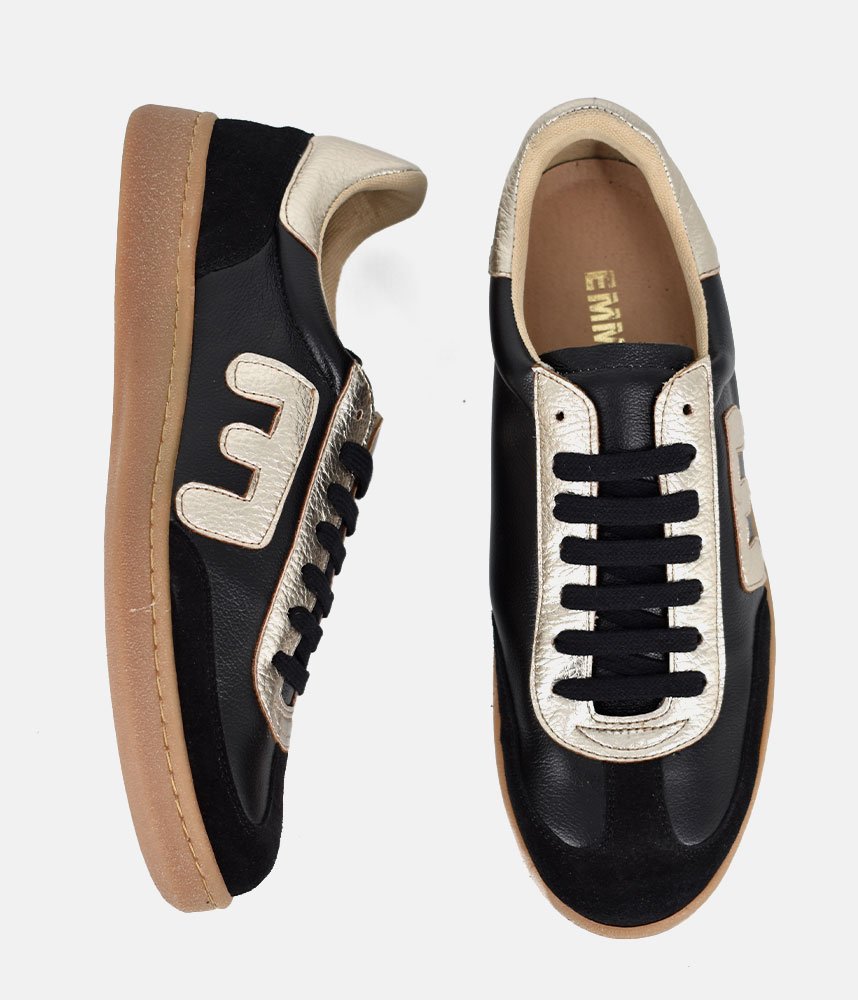 This new sneaker style from Emma features a sleek black leather base with premium black suede overlays on the toe and heel. Featuring bold metallic gold leather detailing on the eyelets, heel tab and set on a durable tan gum rubber outsole for a vintage, athletic-inspired aesthetic. Designed with a padded beige lining for a soft, supportive fit. Ideal for adding a metallic edge to a casual athleisure look.