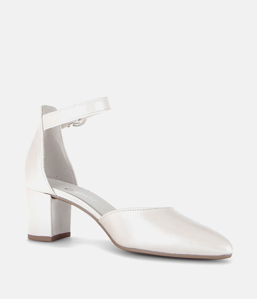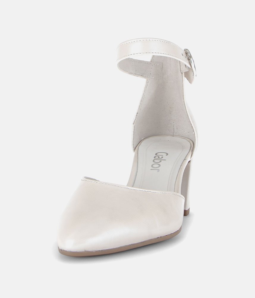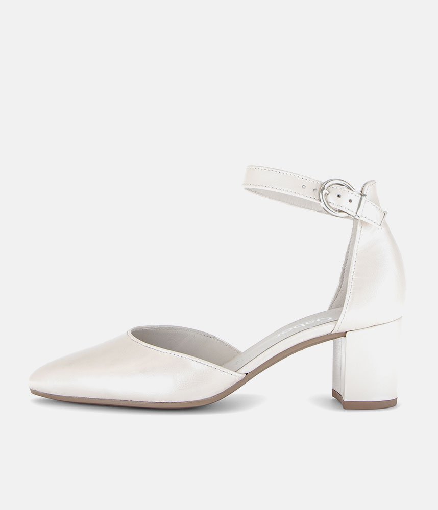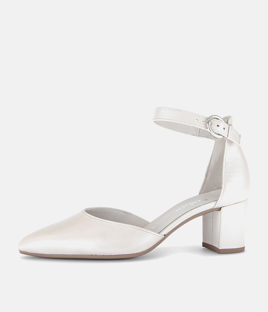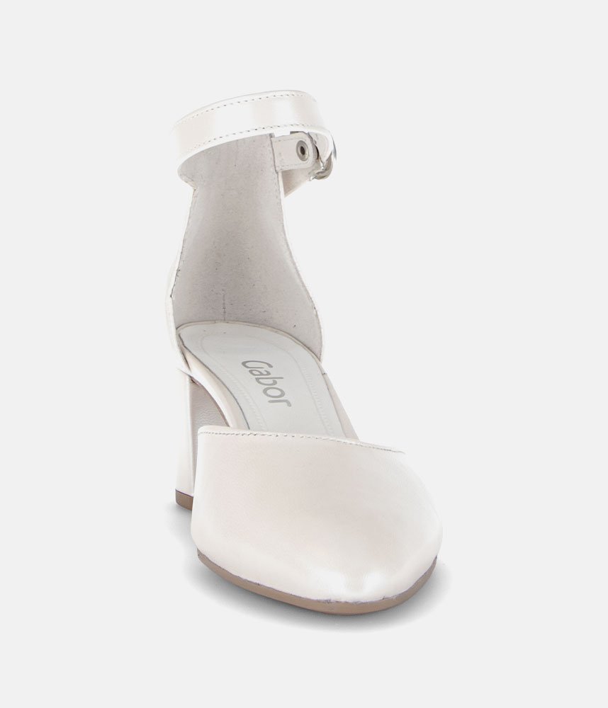 This style from Gabor is perfect for special occasions with it's block heel and Pearl White upper with a subtle shimmer. The covered heel back and adjustable ankle strap and buckle ensure a secure fit.