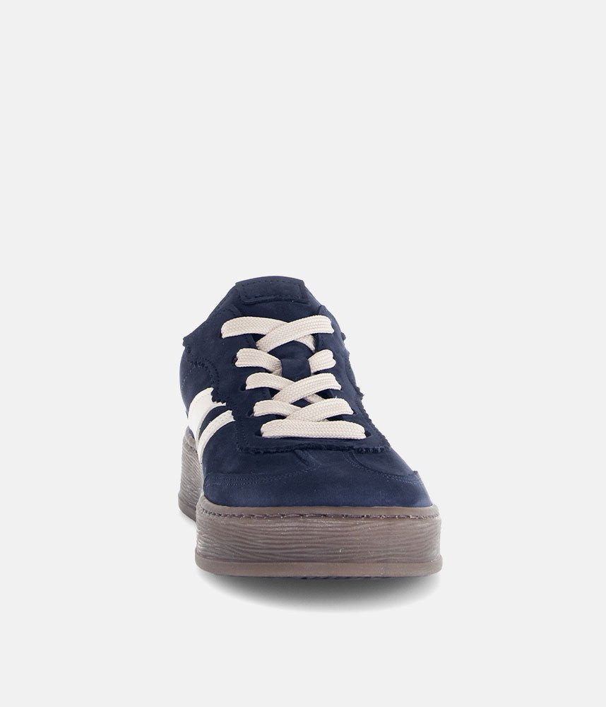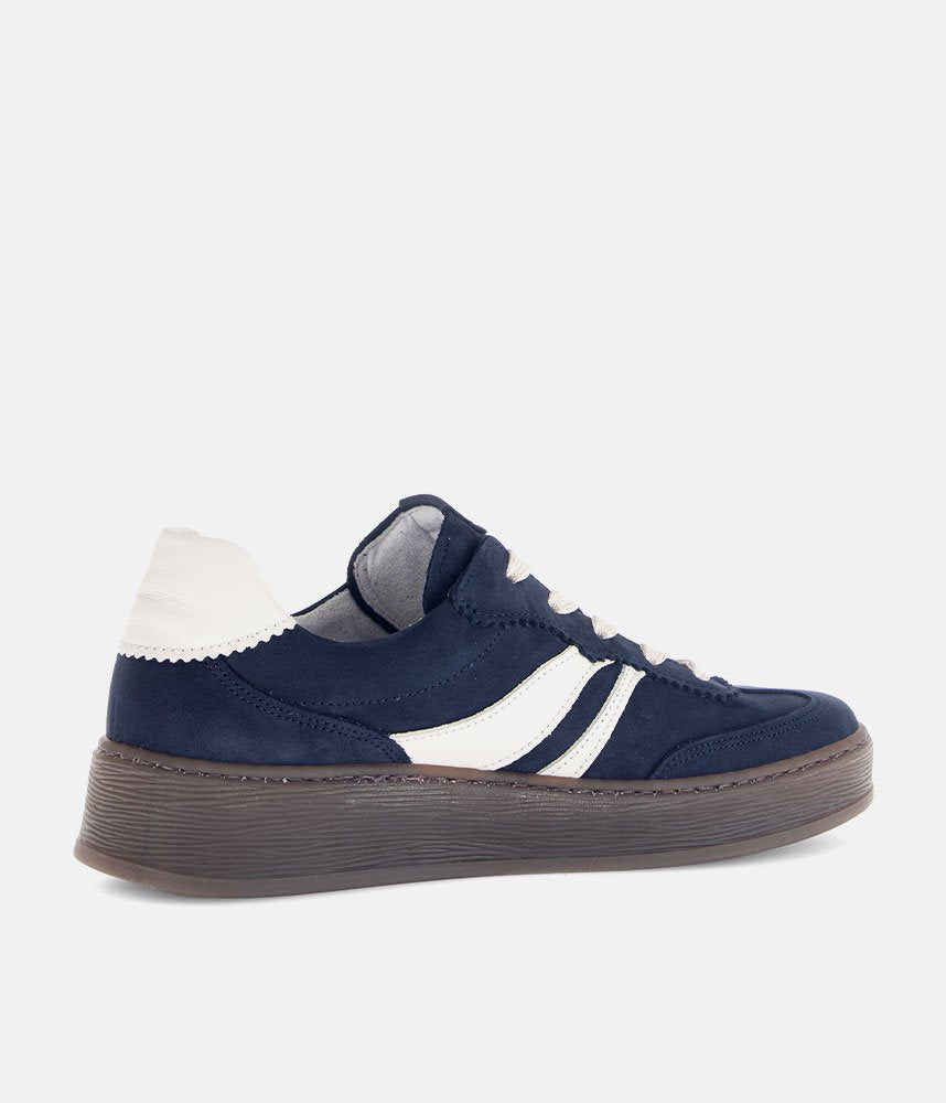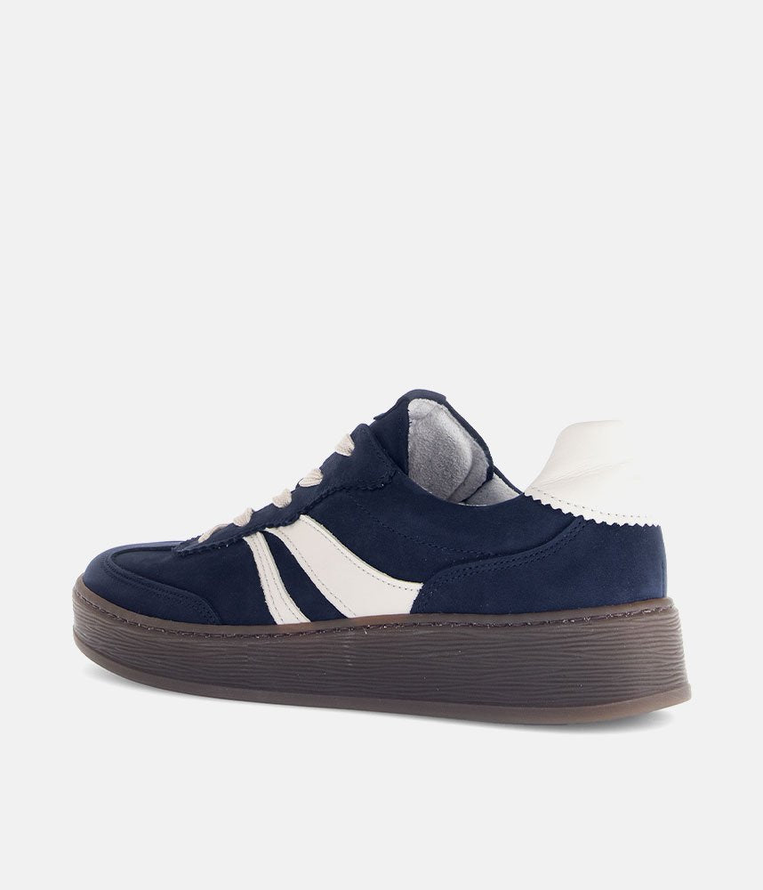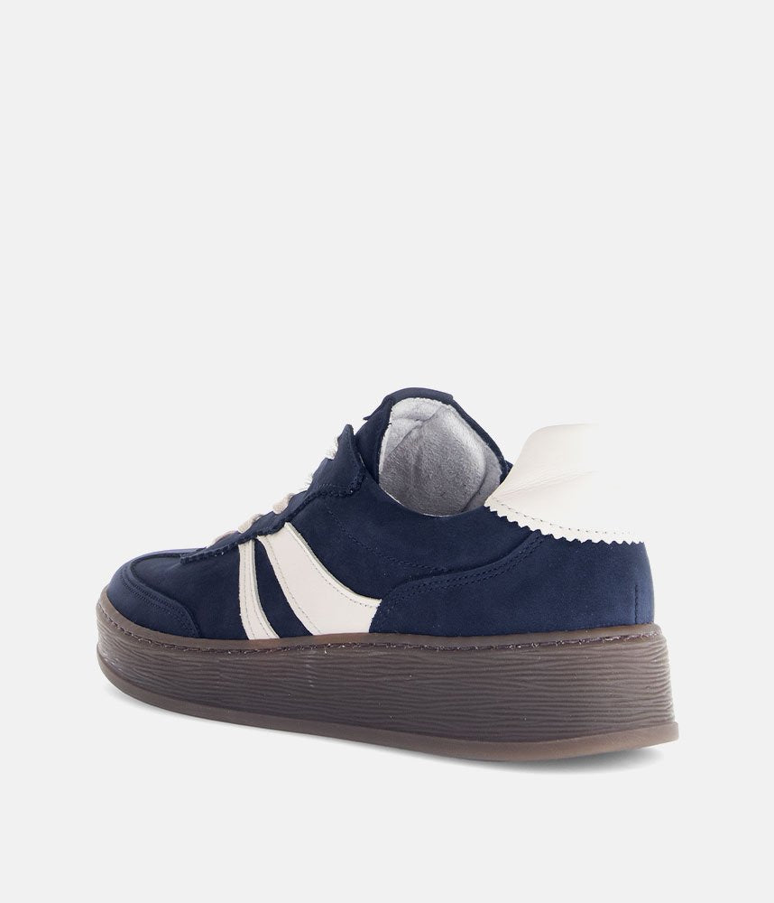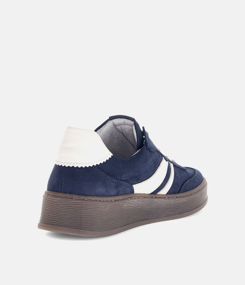 Combine classic style and modern comfort with these versatile sneakers. The deep navy upper is accented with crisp white stripes for a timeless, sporty look. What truly sets them apart is the chunky platform sole, which not only adds a fashionable edge but also provides a cushioned, supportive feel for all-day wear. Whether you're running errands or meeting friends, these shoes will keep you comfortable and looking great.