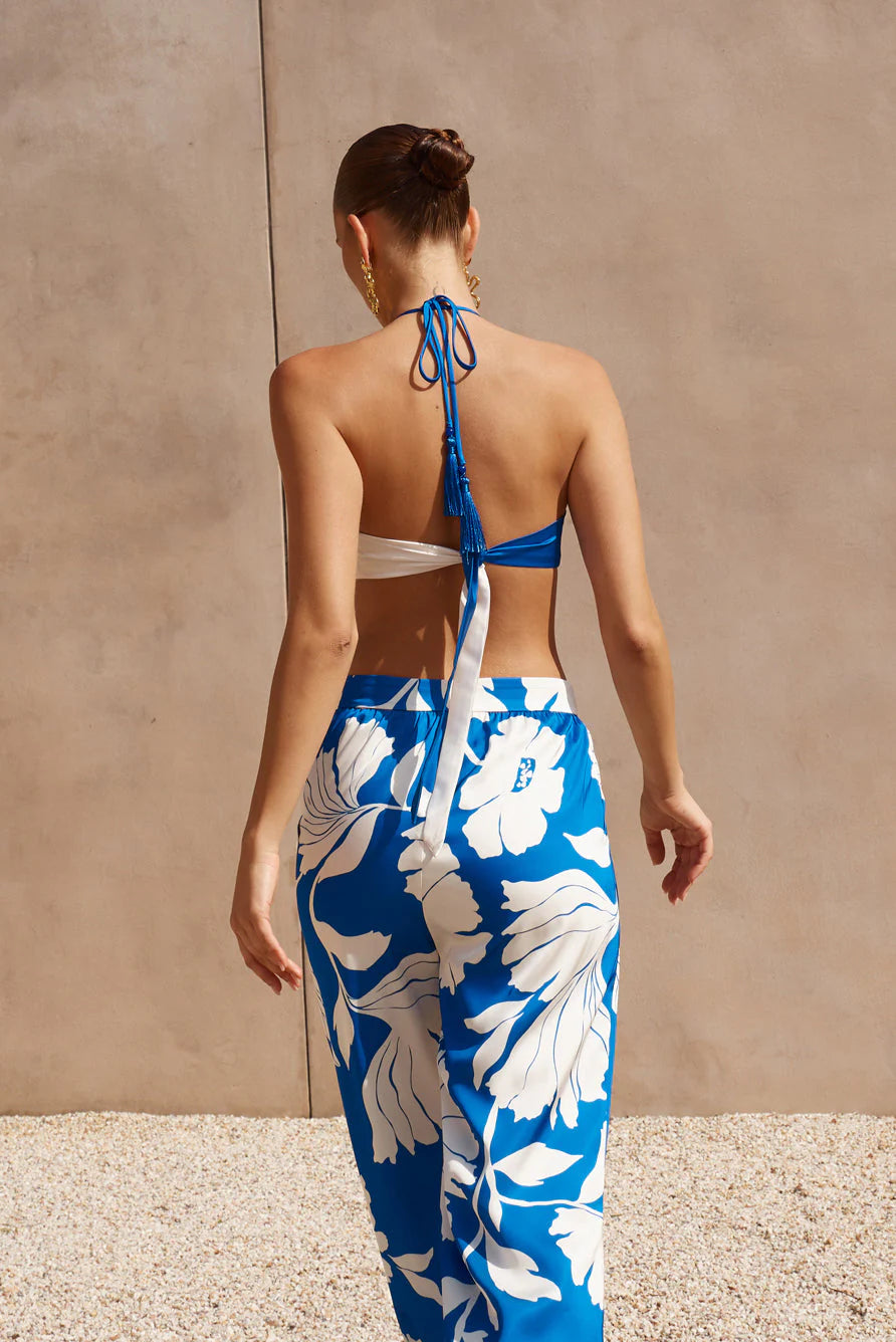 Sometimes less is more. This minimalistic top features adjustable straps and a contrasting blue and white look for a sleek finish. With the bandeau shape and necktie, you can adjust this top to your perfect fit no matter your shape or size. Neck straps feature a tassel fringe end.