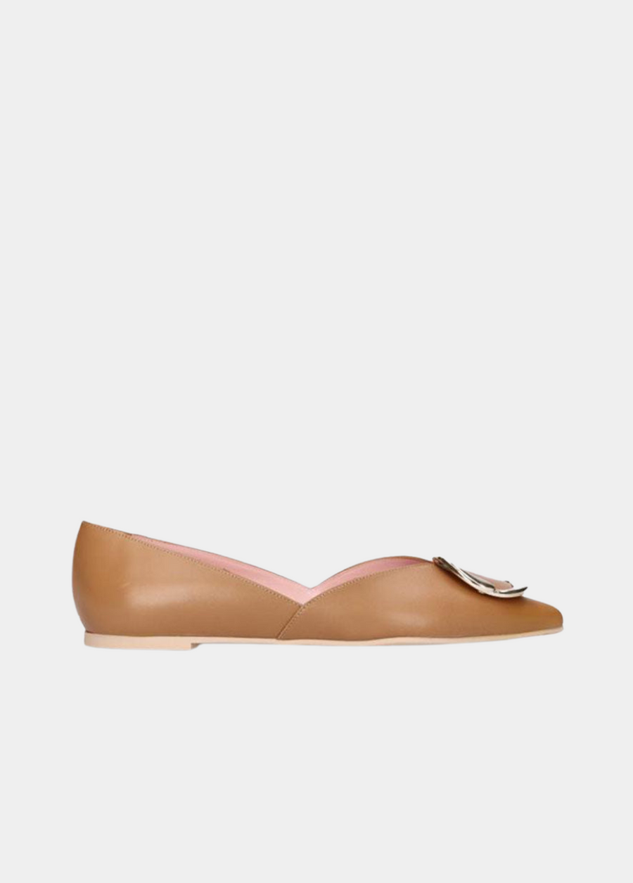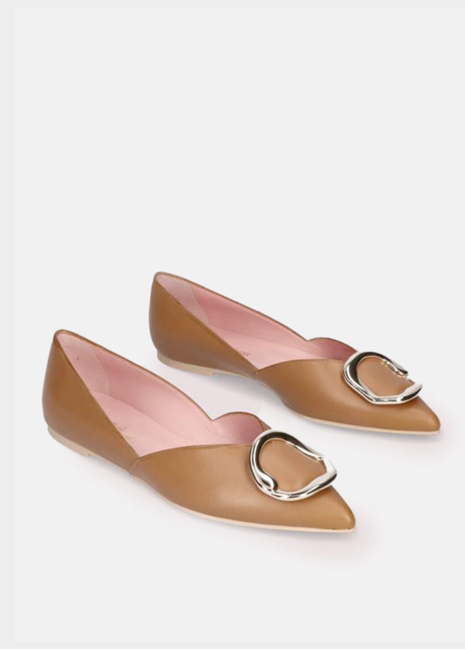 This Sophisticated Ballerina with a pointed toe comes in Brown leather featuring a chrome embellishment on the vamp, with a flexible undersole and cushioned insole making them super comfortable to wear.