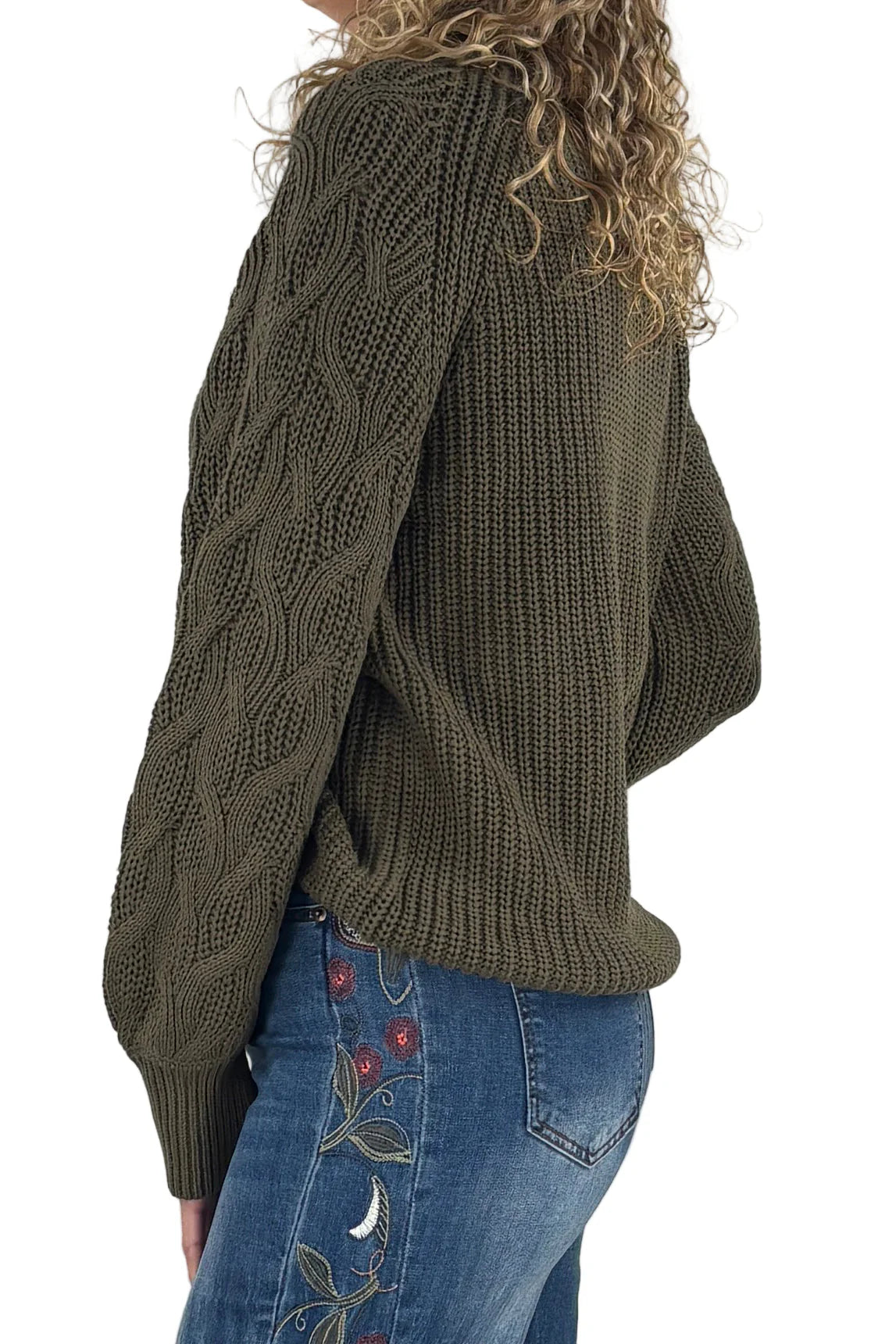 Chilly days become more bearable with a pretty sweater. It's the feminine details and mixed stitching that elevate this sweater. Cable stitching along the draped mock neck and down the loose, blouson sleeves contrasts against the rib stitch of the body. The soft, combed cotton is breathable and provides cozy, all-day comfort.