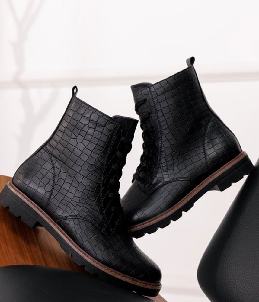 This is great new season ankle boot from a distinctive crocodile-embossed leather upper. The classic black finish and intricate texture provide a sophisticated and luxurious look, while the classic lace-up design offers a secure and adjustable fit. A side zipper allows for easy on and off, and the sturdy lug sole provides excellent traction and durability.