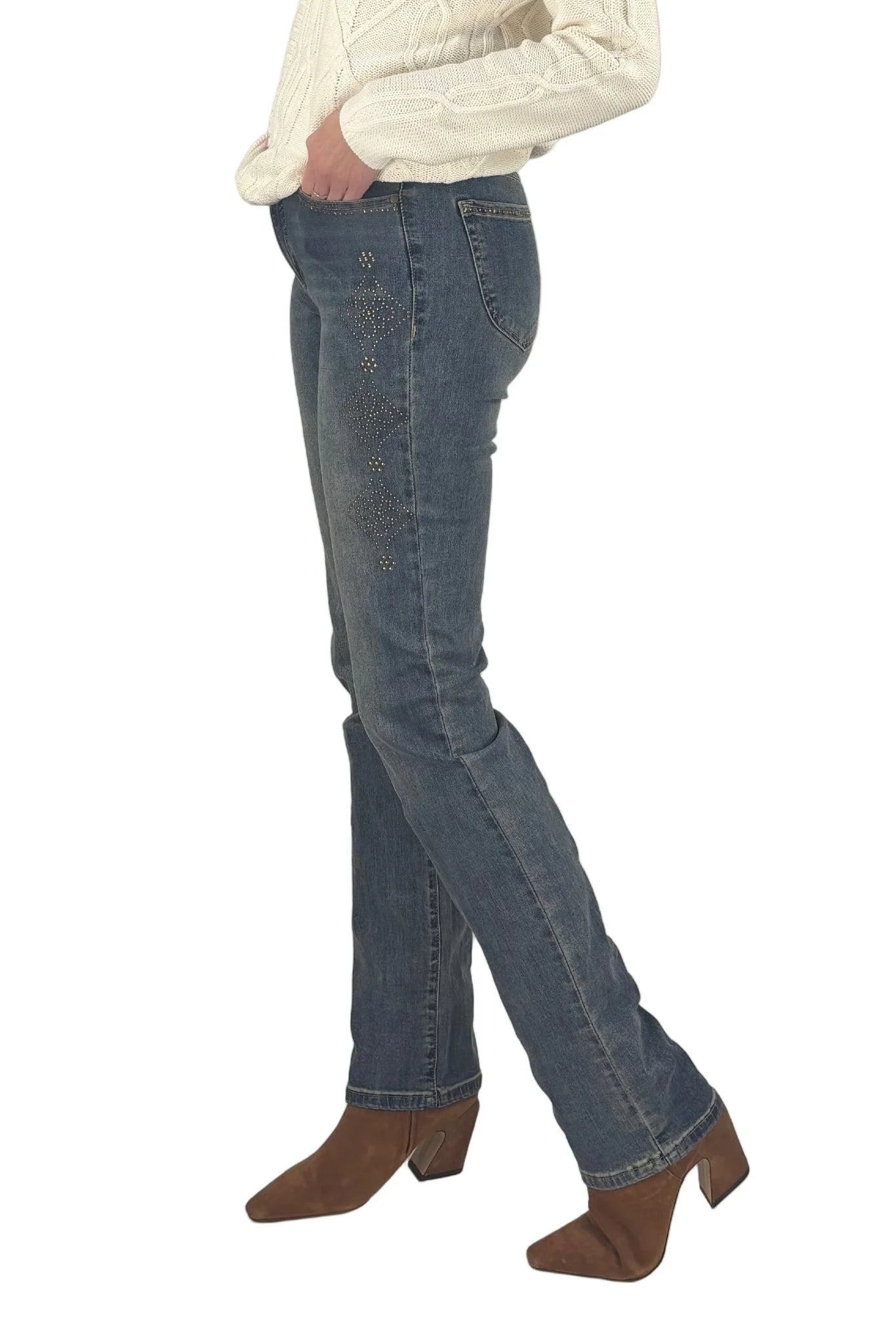 Say goodbye to basic... your classic straight leg jean just got an upgrade. The timeless straight leg style has been given a modern twist with antique brass studs in a diamond, floral pattern down both thighs and studs accent the front and back pockets. The soft stretch denim moves with you and provides all day comfort in a versatile vintage wash.
