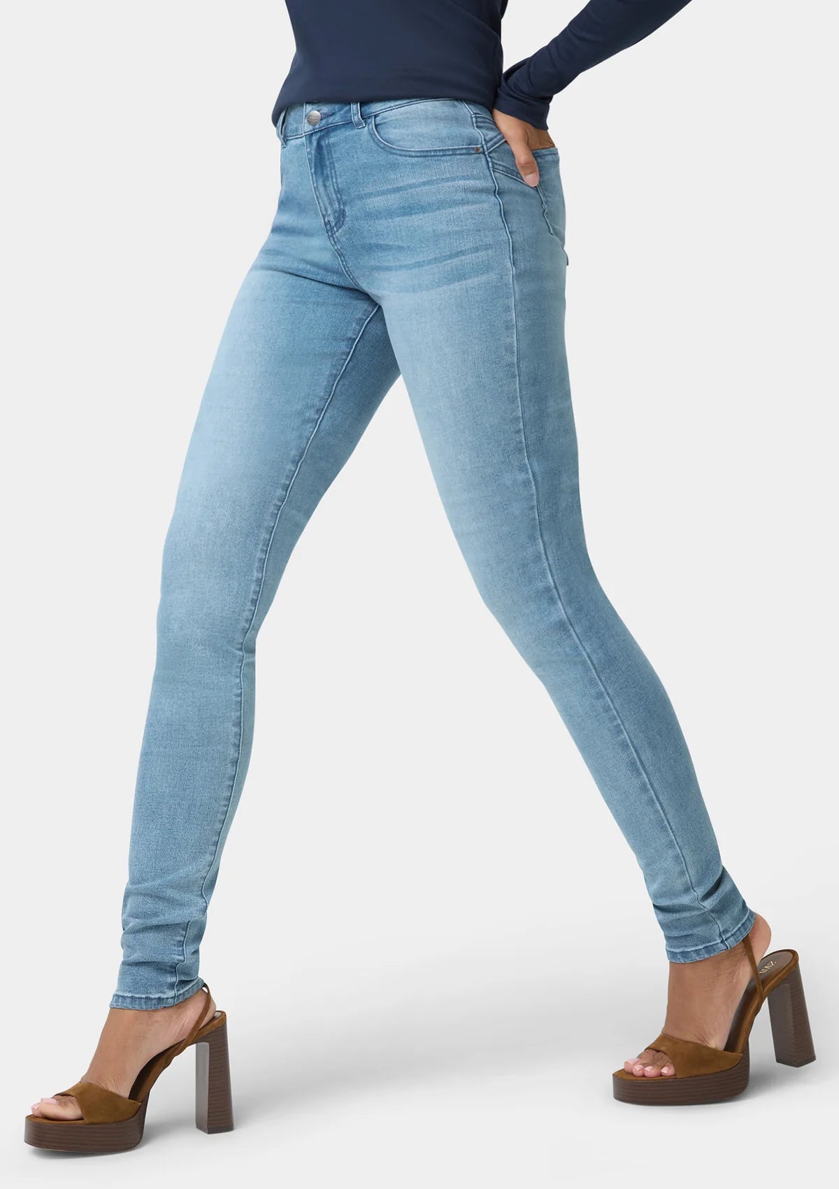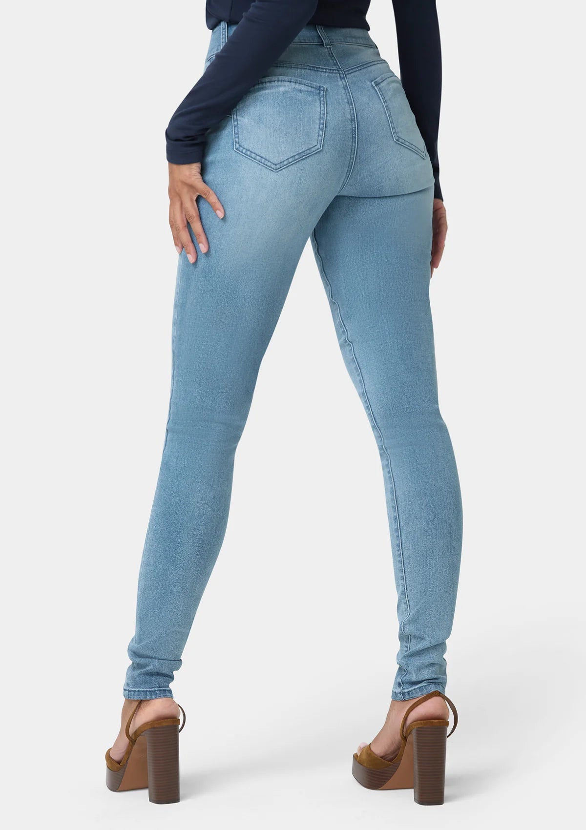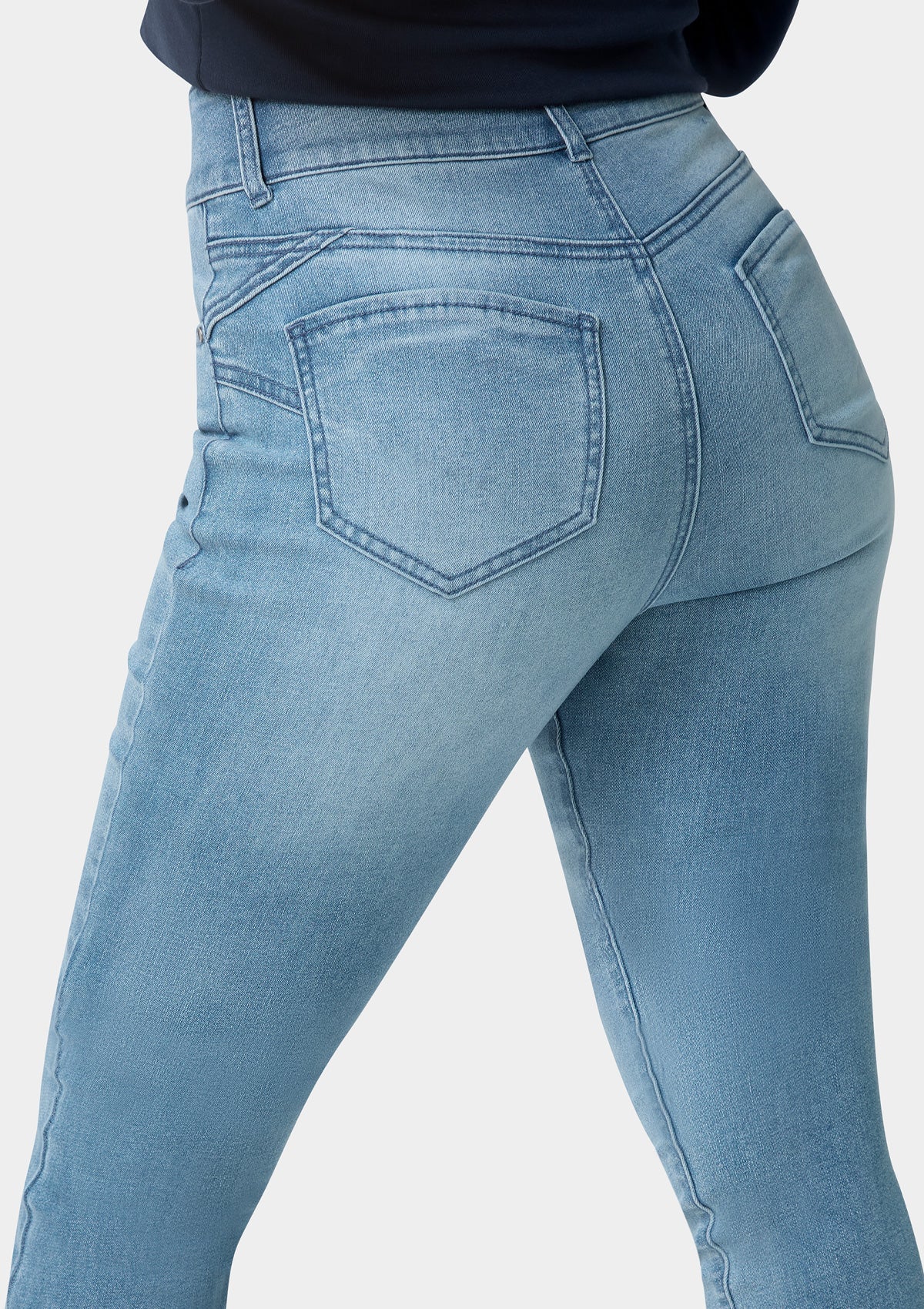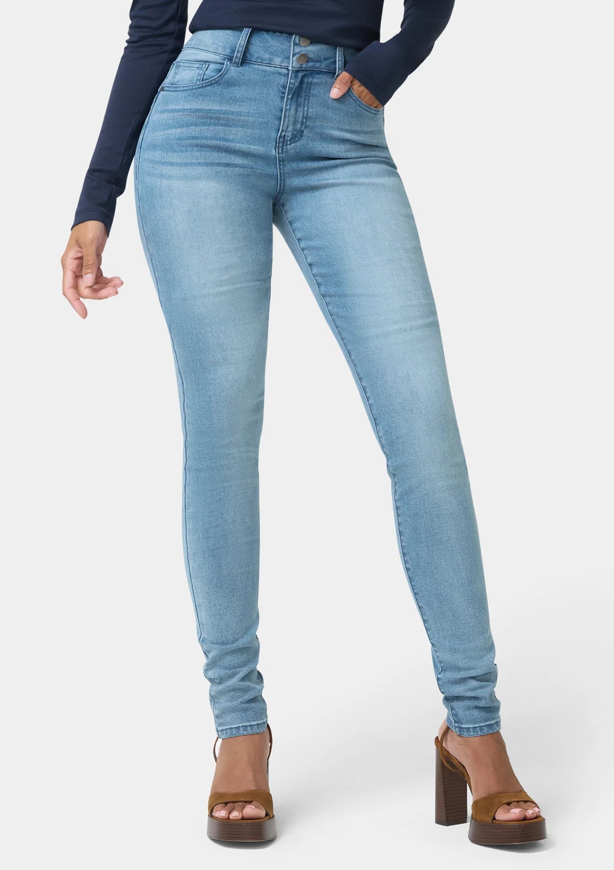 The Sabrina high rise sculpting jeans feature a flattering silhouette, a 2 button closure, and a 5 pocket design. This stretch denim fabric lifts and sculpts you into shape while enhancing your curves.