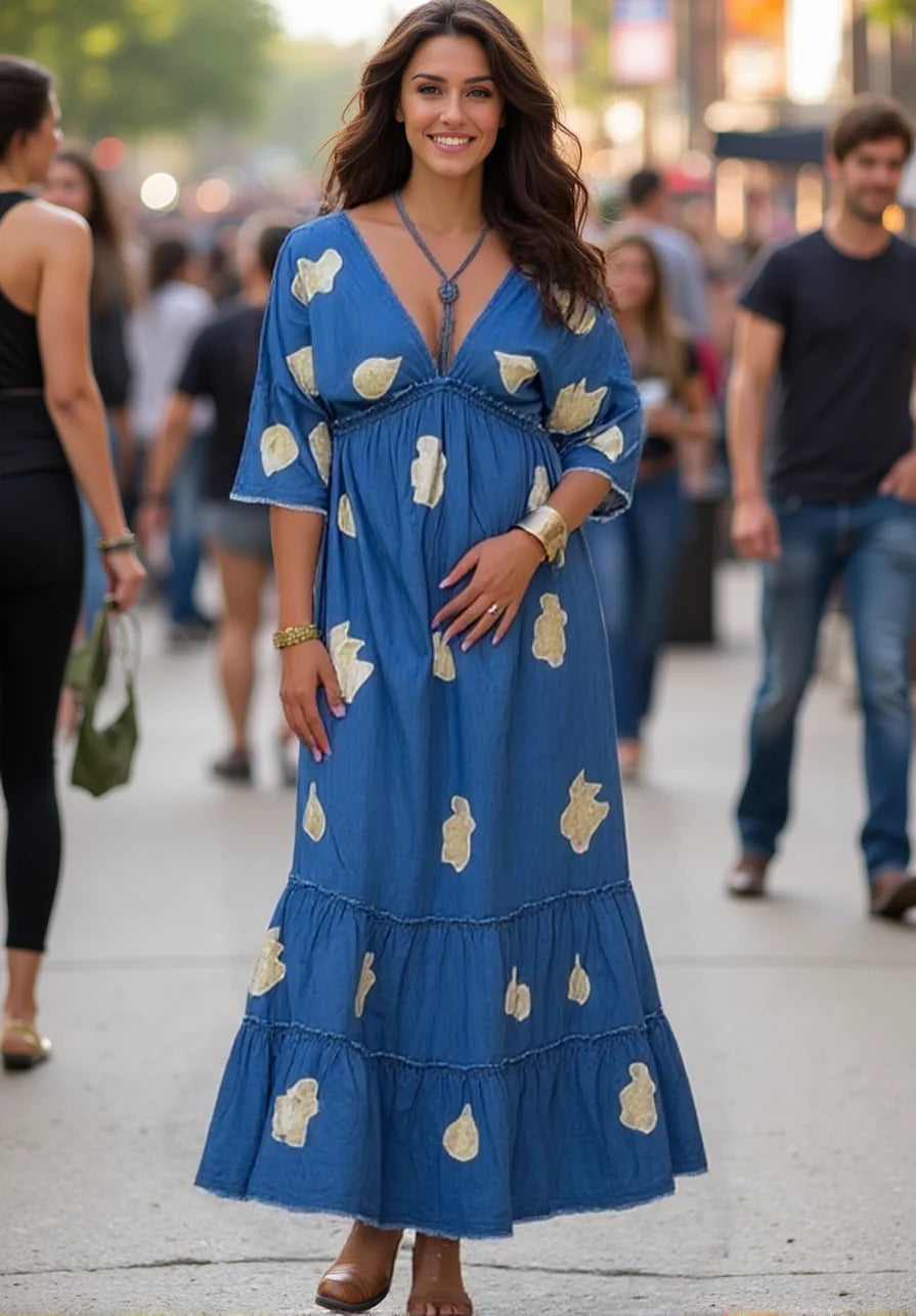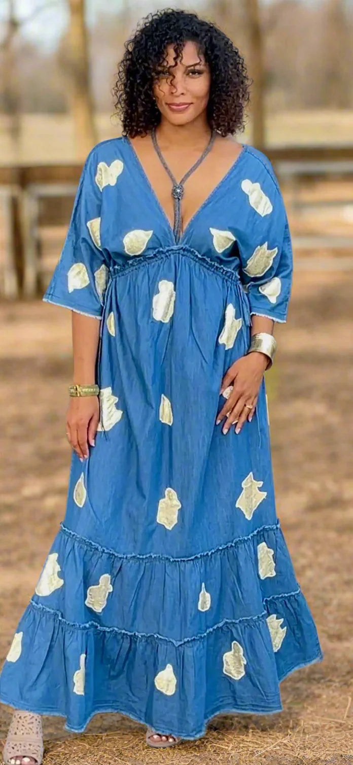 Statement Tiered Ruffle Hem: A dramatic, tiered ruffle hem guarantees you turn heads, adding fearless movement and elegance to every step. Whether you're looking for a tall women's denim dress, a long maxi dress for a curvy figure, or a unique gold applique denim maxi, the Yellowstone is your answer.