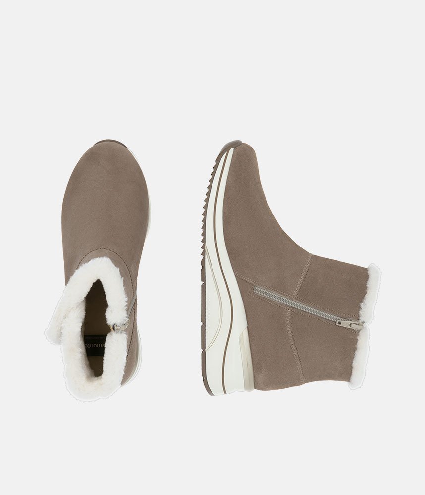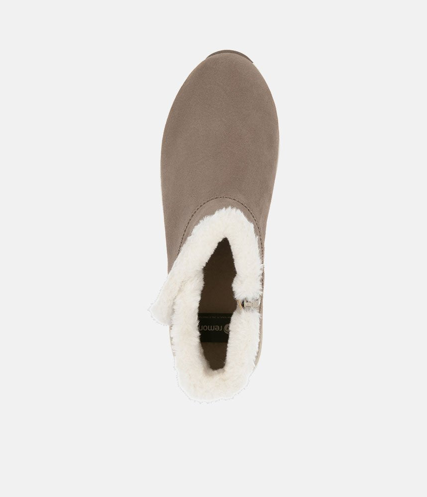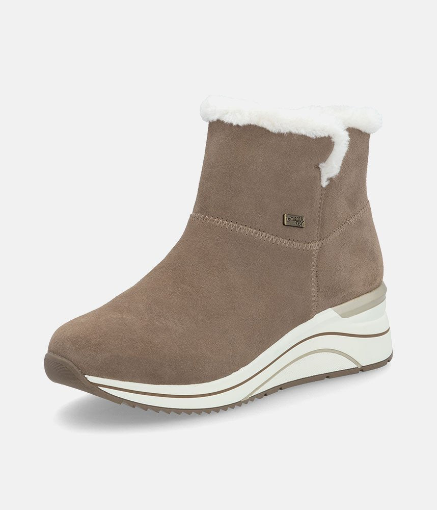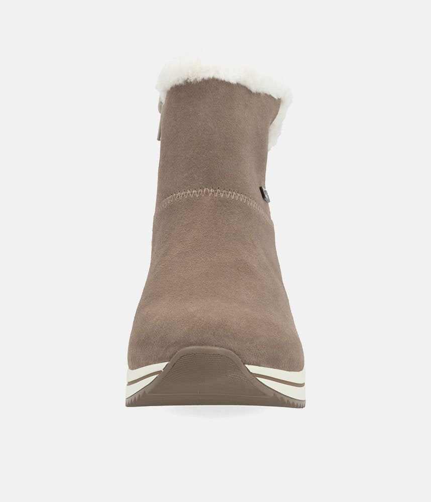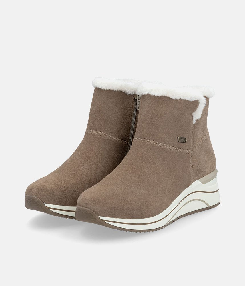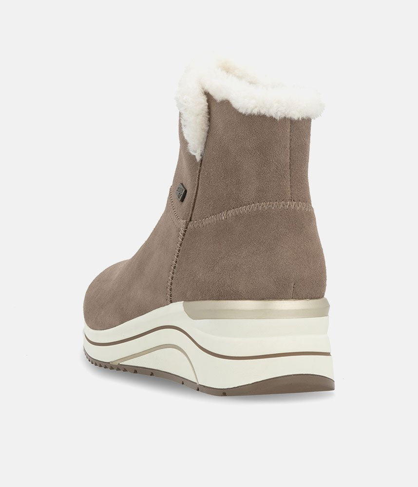 A Super comfortable and stylish ankle boot rocking that sock boot vibe with the feel of a trainer from Remonte. Featuring a combination upper in mix of black patent, suedette and a scuba like textile to the vamp and collar. The scuba textile collar has an elasticated fit which hugs the skin like a sock and is fastened by a zip down the middle. Finished with a wedge heel for added height without losing on comfort. Complete with a soft lining with a cushioned Remonte Soft removable insole.