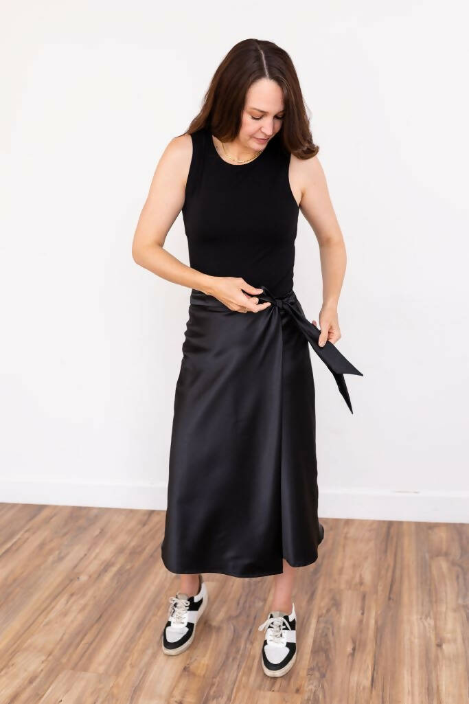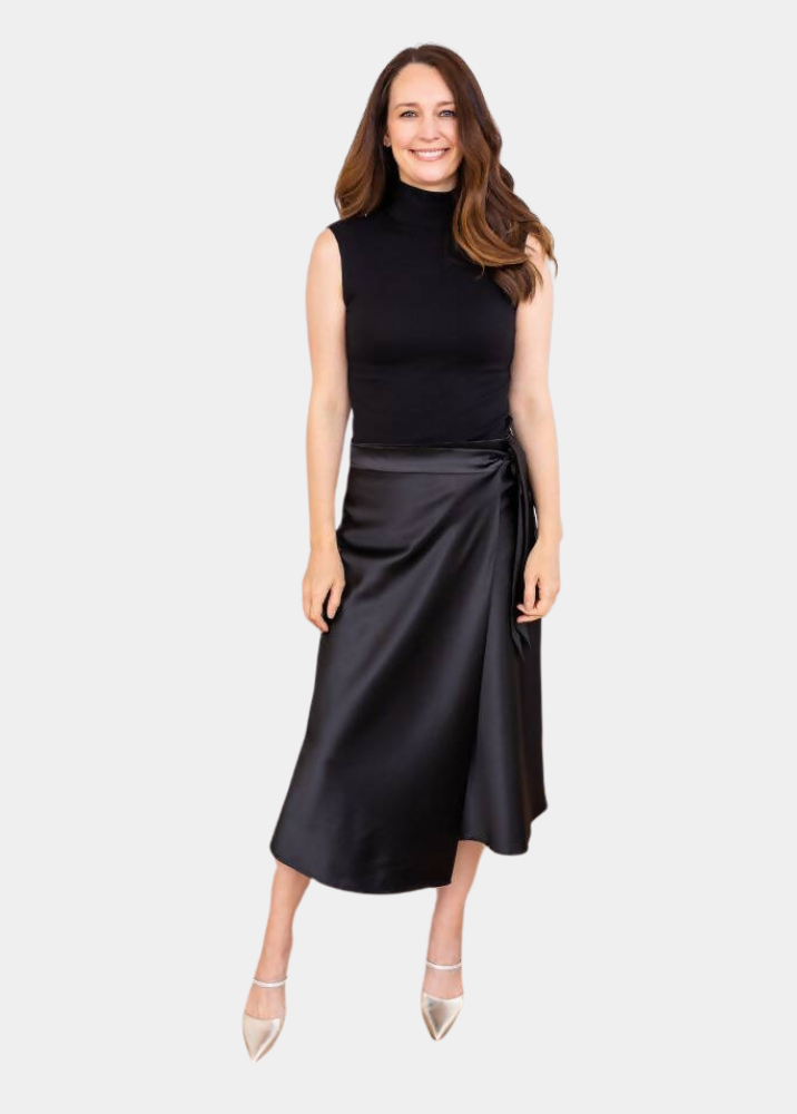 This is the NEW silk-wrap skirt! The perfect midi length with an asymmetrical hem, you don't have anything like this in your closet! It will actually fit you at the midi-length for a classic look all year round. I LOVE the silky satin material in both black and chocolate brown. Pair it with a chunky sweater, slim bodysuit, or graphic T-shirt!