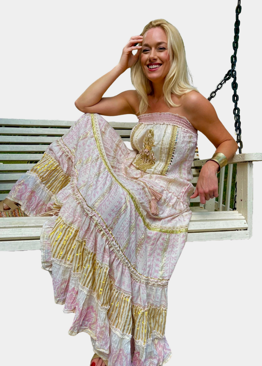 Experience elegance with our Athena Detailed Bandeau Flowy Boho Maxi Dress, a full-length masterpiece crafted from a delightful mix of premium materials, including cotton, crepe, and lace.