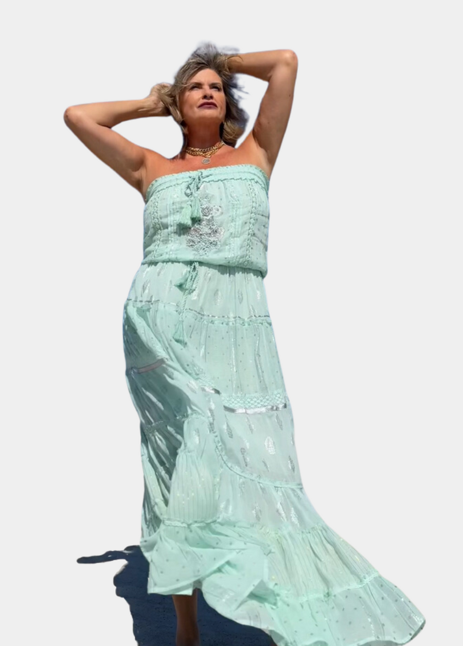 For added sophistication, the dress comes with a 38" cotton slip lining from the waist. Indulge in the exclusive fit of the Athena Detailed Bandeau Flowy Boho Maxi Dress-Seafoam and bask in the compliments that will come your way.