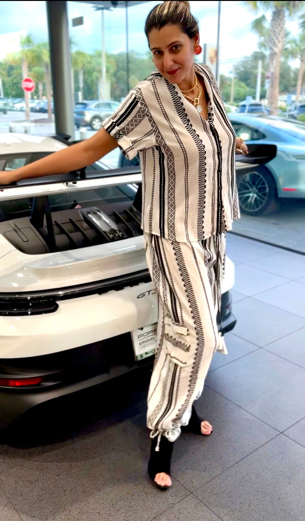 Elevate your wardrobe with the Azteca Two Piece Cotton Jacquard, a luxurious set featuring a sleek monochromatic black and white design.