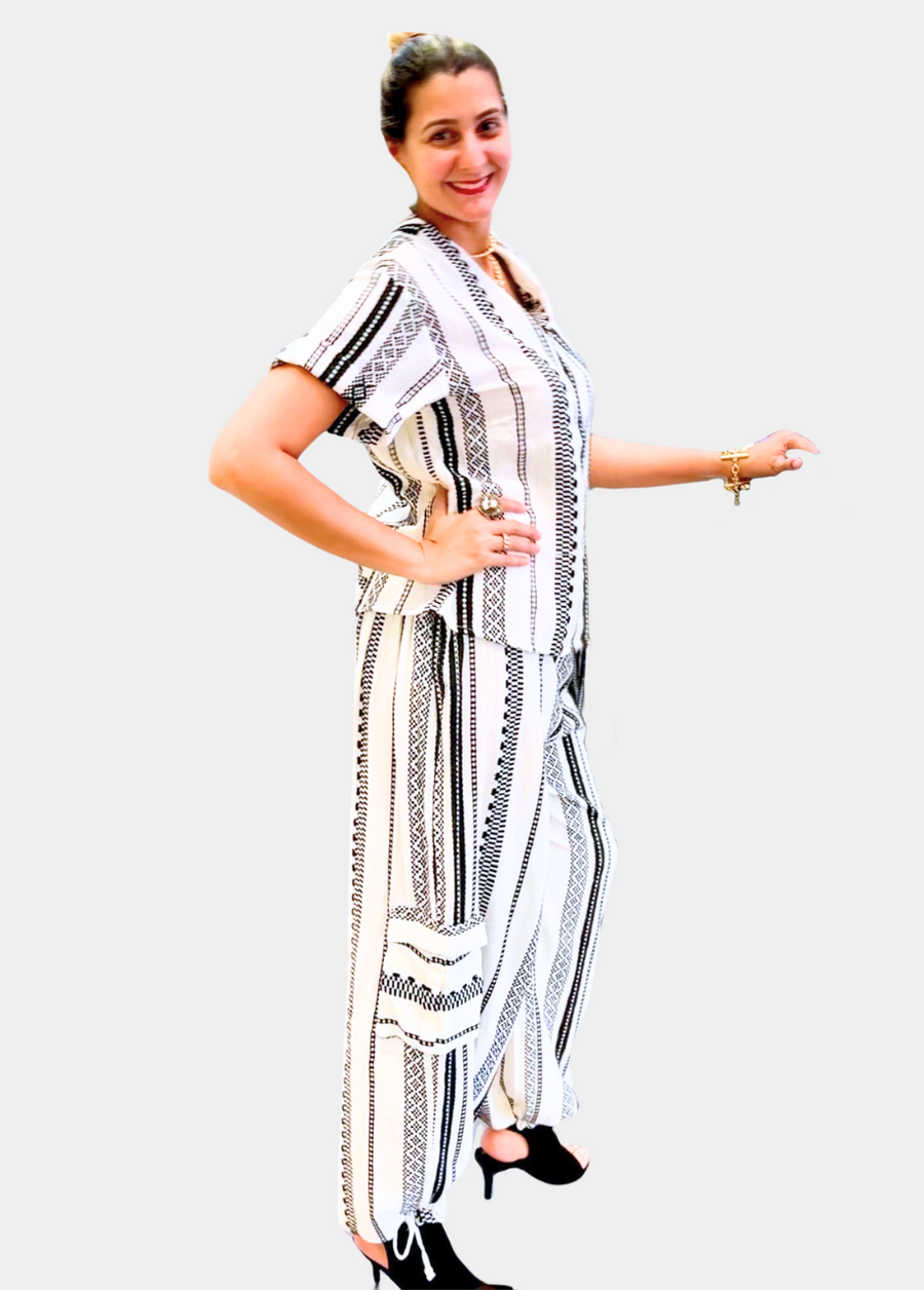 Introducing our Azteca 2 Piece Cotton Jacquard Coord Set with black and white graphic South American pattern. A more subdued ensemble designed for those with more conservative taste with a splash of flair. Designed with the tall woman in mind with 8" sleeve length and 38" inseam drawstring pant elasticized in the back, this set is perfect for both casual outings, sophisticated soirees or lazy days at home. Offering endless possibilities to mix and match with your existing wardrobe this is a must have set.