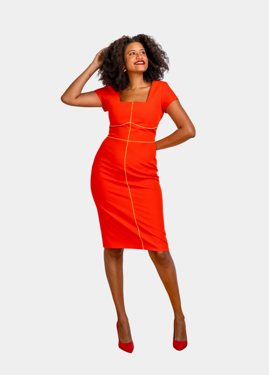 Turn heads and leave a lasting impression in a dress that fits tall women. With captivating contrast piping detail and slight stretch, the Beijing sheath dress accentuates your feminine figure. Stride confidently in the knee-length dress with a modest back split for mobility. Pair the alluring square neckline dress with a blazer for days in the office and style with metallic accents for a night out.
