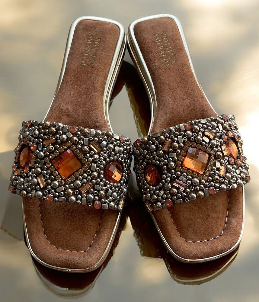 The Bottega Smeralda collections are characterized by high quality that is able to satisfy customers who appreciate the sense of aesthetics and functionality. Bottega Smeralda uses only the highest quality hand-made accessories that perfectly decorate the shoes and make each product unique. You can go ahead and pair these sandals with a flowy long evening dress, adding delicate gold accessories to enhance the luxurious look.