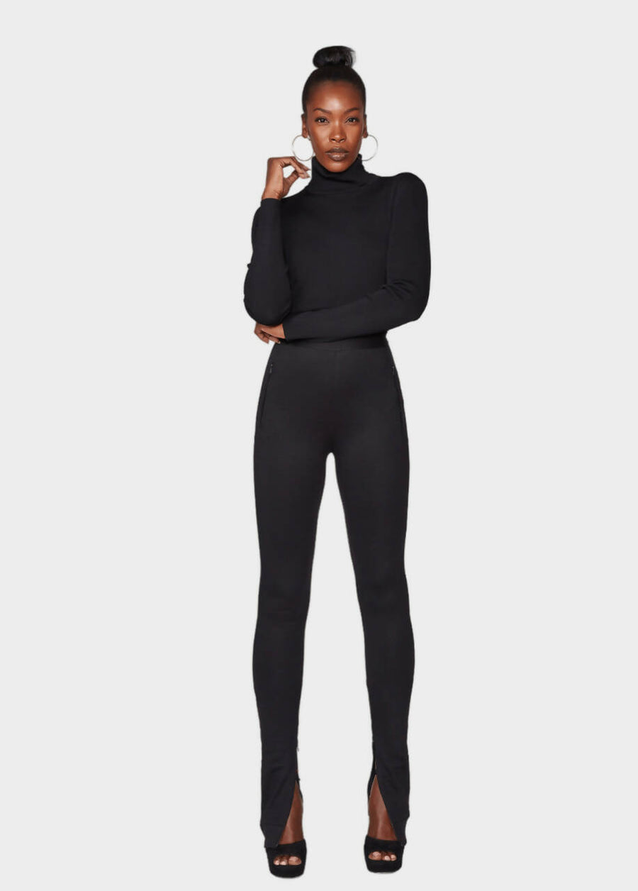 Tired of rocking the same boring leggings? We get it! The Chanel Pant is made from four-way stretch wool-blend Ponte fabric and features a high waist, two black contrast zip pockets, and two invisible zippers at the ankle. Wear the ankle zippers open with a heel to dress it up or closed with a sneaker to dress it down.