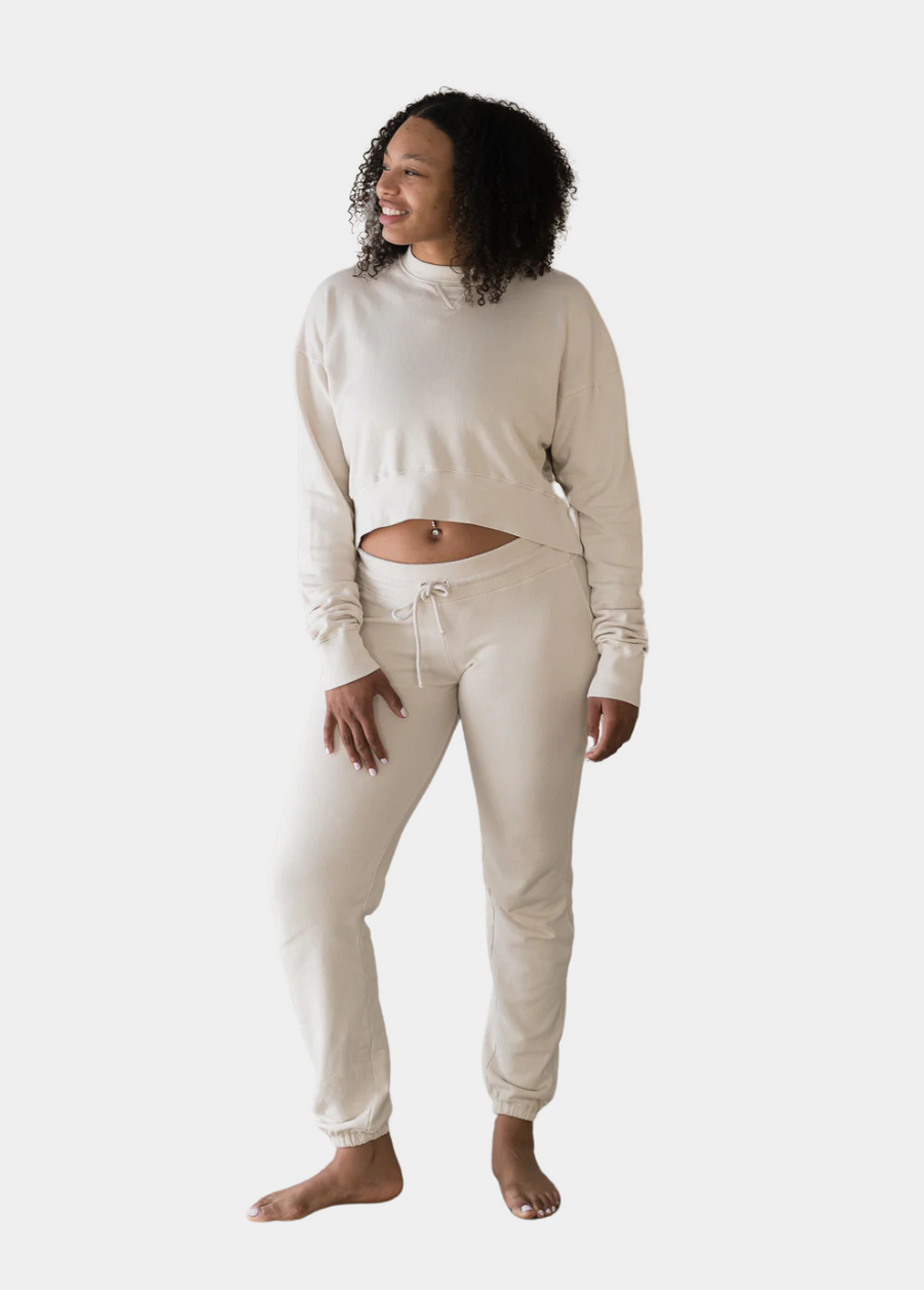 This Crop Crew is made with the coziest 100% Cotton Brushed Loop which is known for its soft, textured feel and warmth. The luxurious texture retains heat without feeling overly heavy, offering a slightly thicker, cozy feel. It's the perfect choice for loungewear.