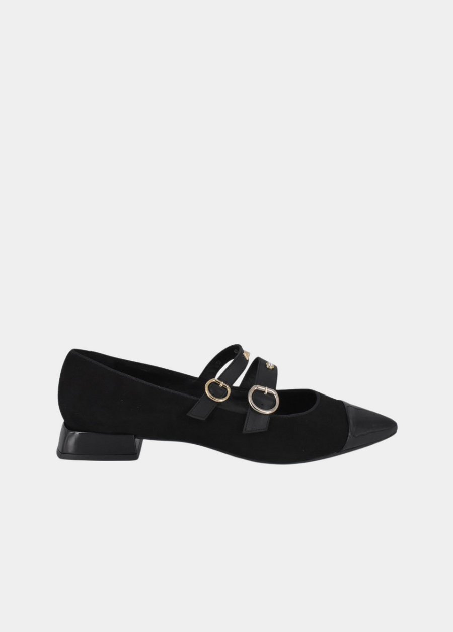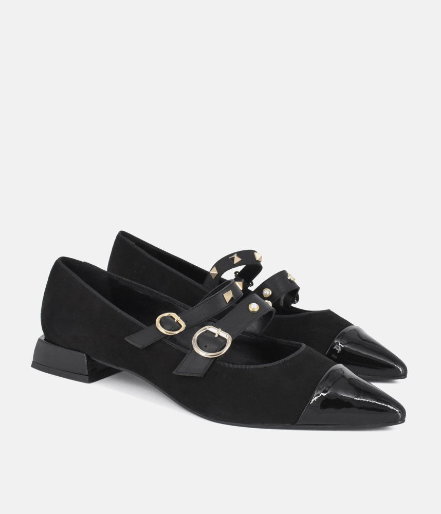 These Fashionable Flats from Dansi have a stylish-looking combination of Suede on the upper with a patent toe cap and heel. Finished to perfection with decorative studs and pearls, this slip-on style has elasticated straps for a cozy fit and for easy on and off.