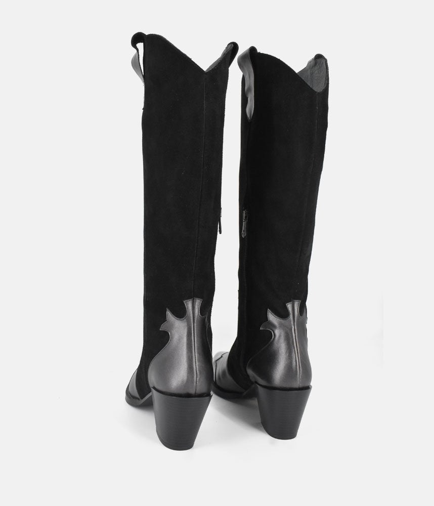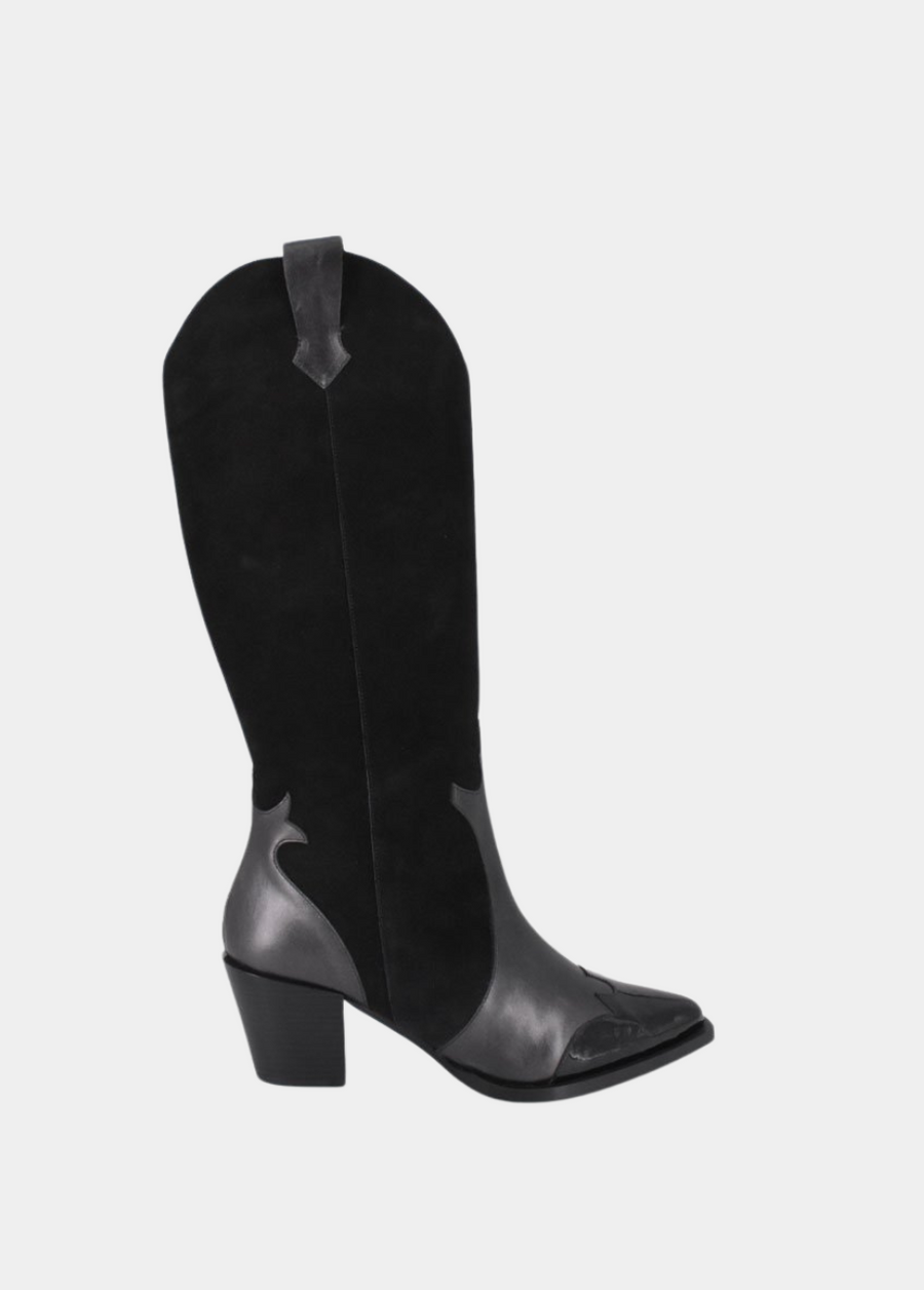 This New Season style is crafted from a premium leather and suede and feature Western-style cut out detail. An easy to wear pull on style featuring tabs to the top-line, featuring an almond toe and manageable stacked heel make up the silhouette. Pair them with a mini skirt or with jeans for a more casual outfit. cut out Western-style panelling.