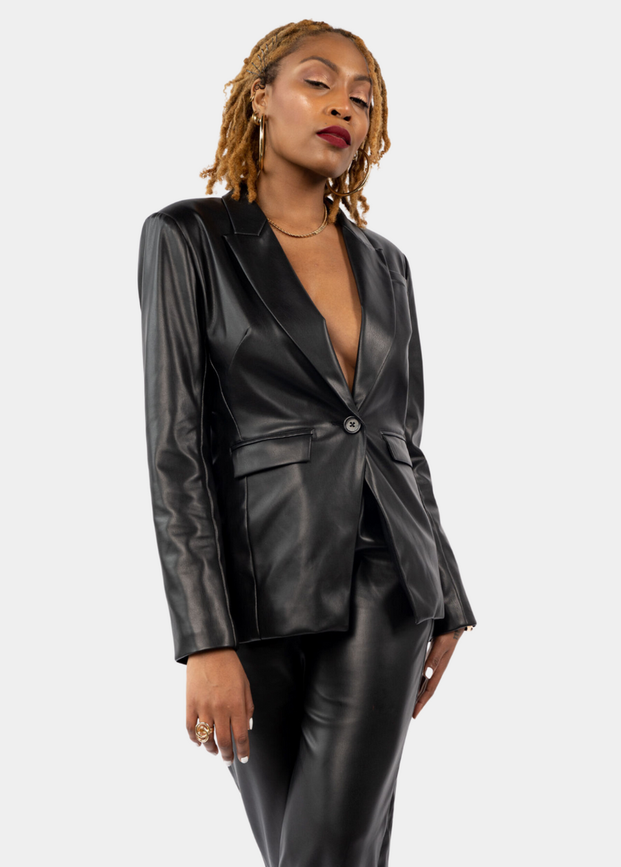 The WHITNEY ALLYSYN Fall/Winter Capsule Blazer is crafted in a smooth medium-weight vegan leather fabric in a chic, waist-defining silhouette. Fully lined, this blazer can be worn alone in the Fall and Spring, or layered under your heavier coat in the Winter. She’s complete with 2 deep pockets fit for your large phone with flaps that can be tucked in for a more seamless look. The internal functional chest pocket perfectly fits your ID and some cash. Style the Capsule Blazer with the Capsule Pants for a complete boss lady look, with or without your favorite crop top.