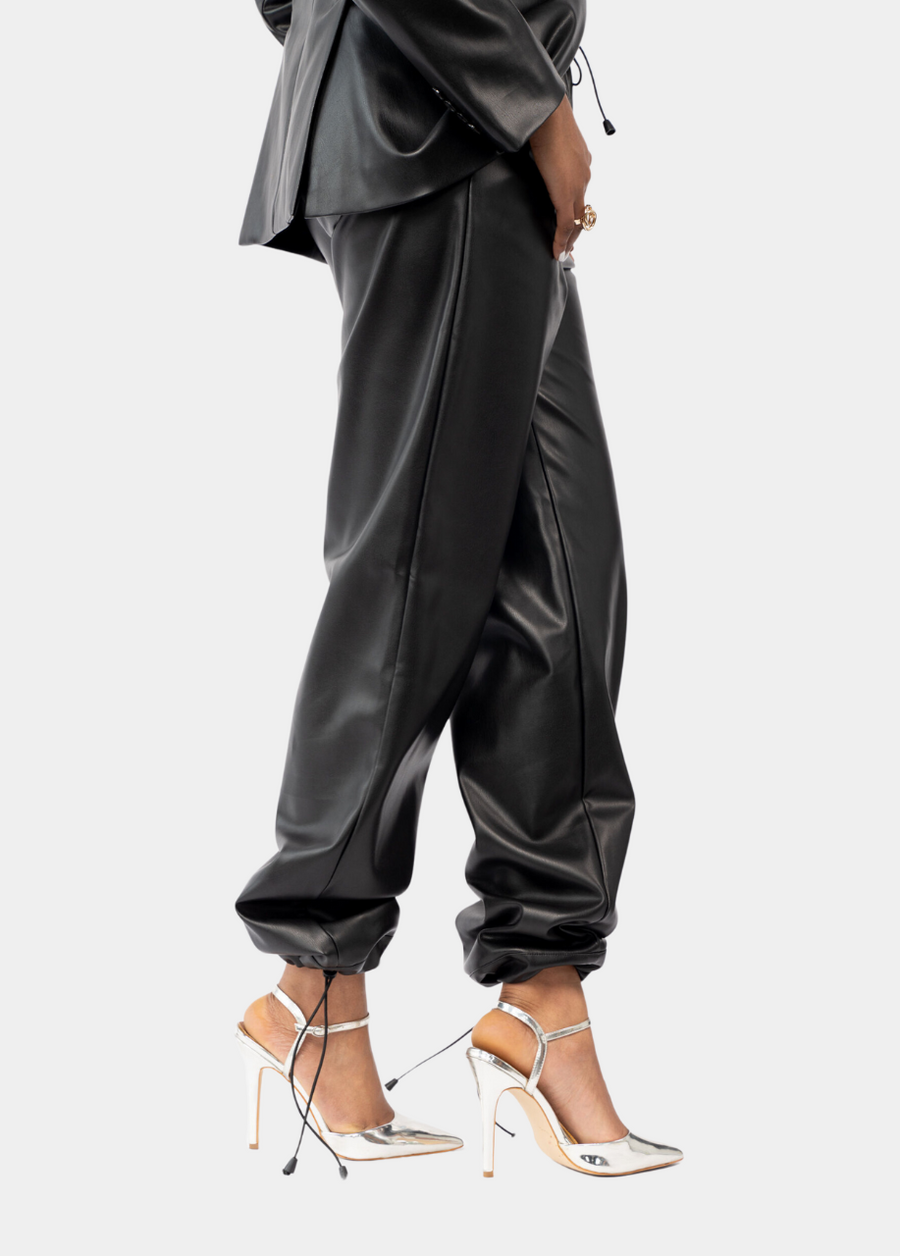 The WHITNEY ALLYSYN Fall/Winter Capsule Pants are crafted in a smooth medium-weight vegan leather fabric. Two looks in one, activate the drawstring at the cuff to take these pants from work to happy hour in seconds. Offered in 2 lengths, she’s complete with an elastic drawstring tie waist and 2 deep pockets fit for your large phone. Style the Capsule Pants with the Capsule Blazer or a silky blouse for a complete look.