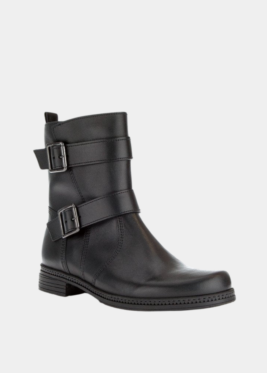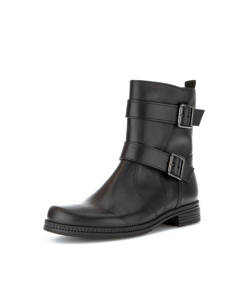 Release your inner rock chick with these biker style boots from Gabor. The black leather uppers are completed with buckle and strap detailing, featuring a side zip for easy on and off. On the inside a super soft lining and removable insole are perfect for keeping feet warm during th winter months. The ultimate in style, this classic silhouette wears effortlessly with denim or dresses.