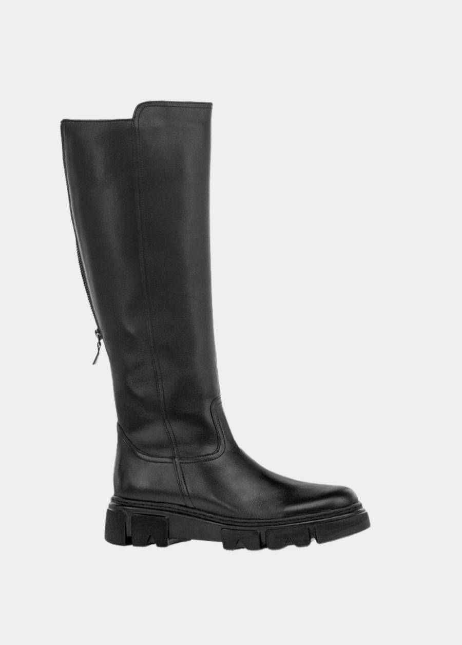 This is a Gorgeous Long Black Leather Boot from Gabor with an on trend chunky sole adding a modern twist. This boot features a full-length zip on the inside and in addition the boot features a zip at the back to offer a Vario width which helps you achieve an optimal fit.. Part of Gabor's Best Fit range this boot offers a wider stepping surface in the ball area of your foot, allowing for more movement of your toes.