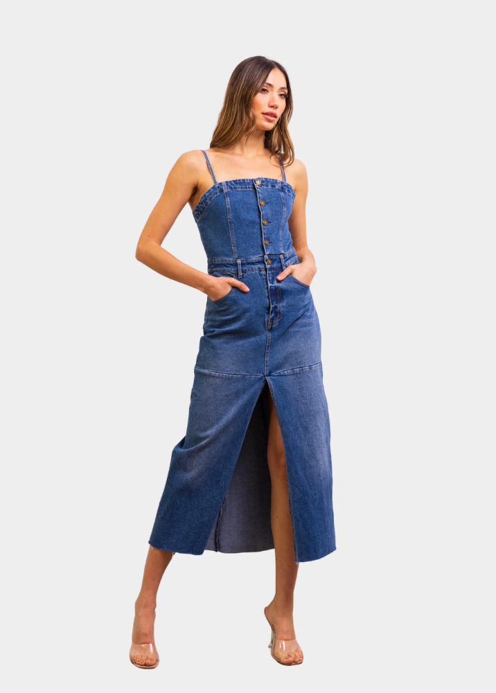 Our I Need You blue denim midi dress is your go-to easy daytime dress. Featuring button and zip front and flowing denim fabric from the hips down, this dress will become your daytime staple.