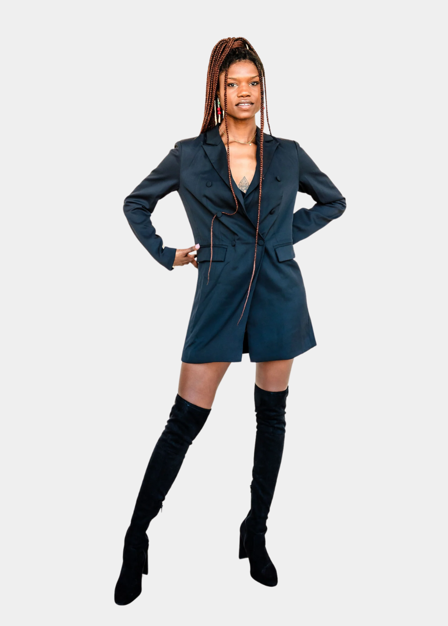 Level up your workwear with our Jen Blazer in Black and Elevated Work Pants—designed exclusively for tall women. The Jen Blazer features a tailored fit with long sleeves and a sleek, polished look, while the Elevated Work Pants offer a professional yet comfortable fit with a flattering pleated front and an elastic waistband in the back. Together, they create the perfect blend of style, sophistication, and comfort. Bundle and save on this must-have tall girl power suit!