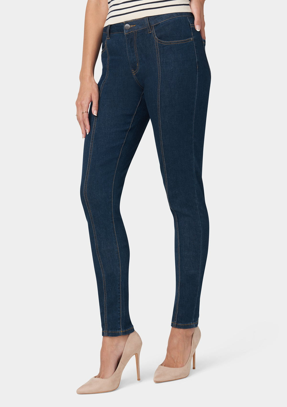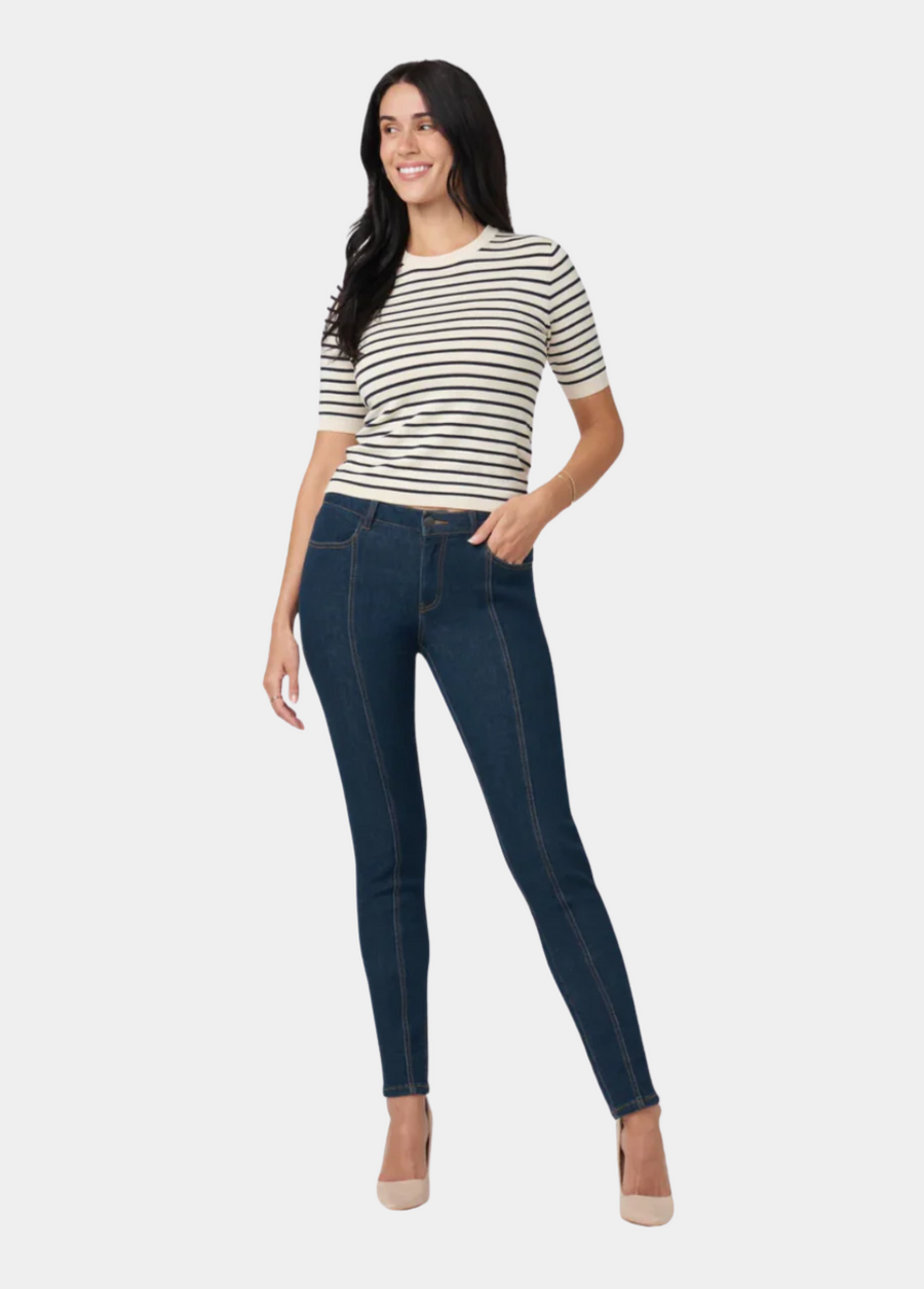 Embrace sleek sophistication with our Jessi Skinny Jeans, featuring a dark wash complemented by contrast stitch seam detail running down each leg. These classic 5-pocket jeans offer a fitted silhouette that accentuates your shape, crafted for those seeking a blend of everyday elegance and comfort.