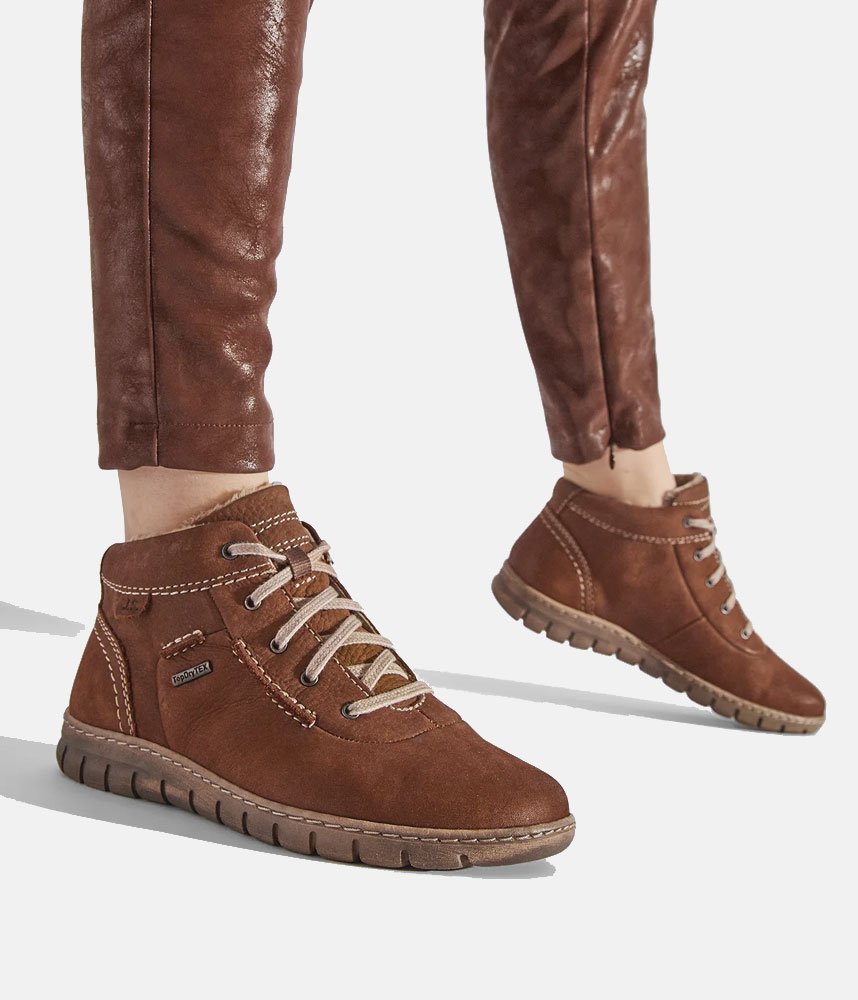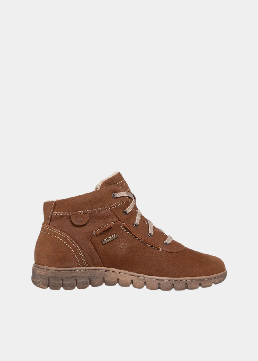 These Josef Seibel ankle boots are waterproof making them a fantastic choice for all weather types. With a light PU sole, you’re able to walk long distance with ease, as well as gaining maximum grip. Featuring a fur trim and contrasting stitching, and lace fastening, where the boots can be secured to your preference. A removable insole is also a feature of this boot.