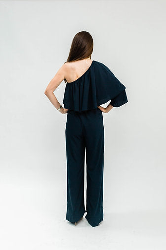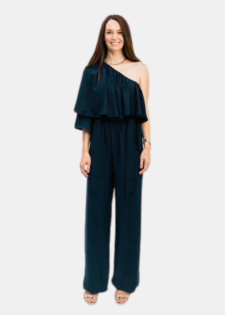 Named after my sister, this is the perfect jumpsuit for any special event. It has a one-shoulder ruffled neckline with a long ruffled sleeve. Elastic waistband with a tie that you simply pull on, there are no zippers or buttons! It is comfortable with a relaxed inseam, pockets, and wide legs. Get ready to make a statement in this jumpsuit!