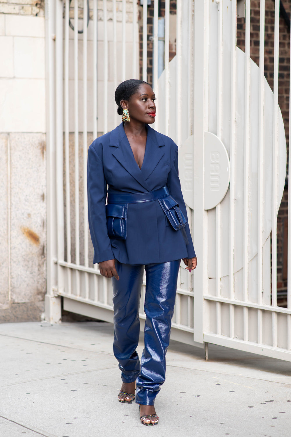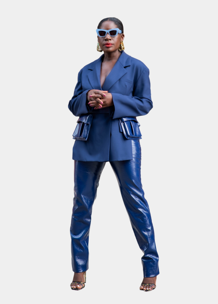 Level up your wardrobe with The Lauren Pant, the 2-in-1 straight leg stunner designed to take you from day to night in sleek style. With its deep blue textured vinyl fabric and removable belt with pocket, this pant is both fashion-forward and functional. It features a removable belt with pocket detail, a 38" inseam hitting at just the right spot for a flattering, elongated look and 5 pocket detail.