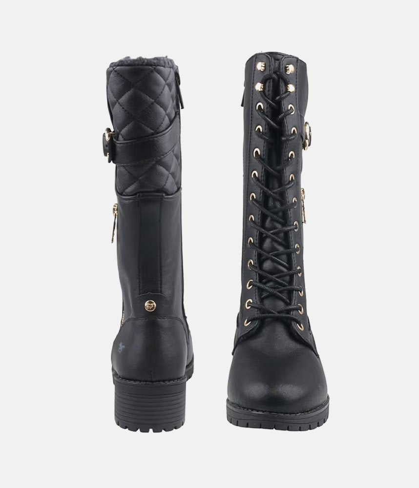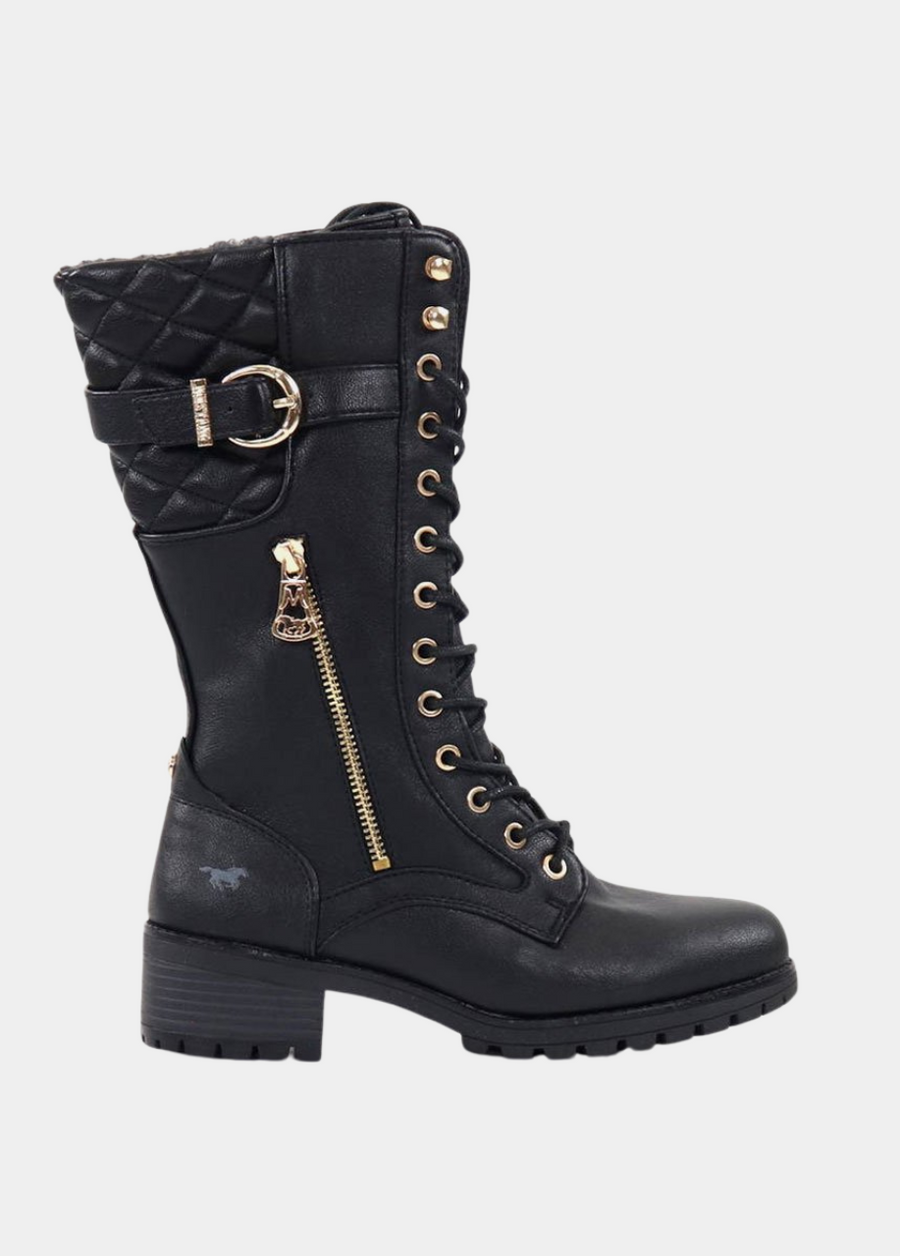 This is a Fantastic New style this season from Mustang, a Trendy midi boot that is a current fashion favourite! The Upper features lovely quilting with a decorative zip and buckle to finish the look to perfection. The soft interior is super cozy and the side zipper is practical for easy on and off. The lacing also allows for an adjustable fit. A trendy companion that never goes out of style and will work just as well with dresses as they do with jeans.